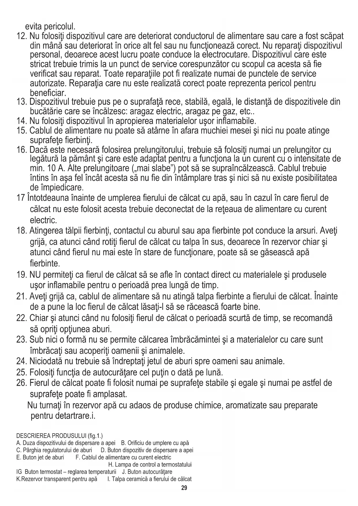 5. Cele mai bune efecte sunt obţinute în timpul călcatului uscat la temperaturi medii: temperaturile prea mari sau ţinerea fierului de călcat pentru o perioadă prea lungă de timp într-un singur loc poate conduce la apariţie petelor galbene (arderi). 4. Orice fel de murdării, pete devin mai perpetue după ce au fost călcate de aceea înainte de a începe călcatul trebuie să verificaţi dacă îmbrăcămintea este curată. Dacă nu, aceasta trebuie mai întâi spălată. DATE TEHNICE Funcţia de dispersare a apei Asiguraţi-vă că rezervorul (K) este umplut cu apă. Apăsaţi butonul pentru dispersarea apei (D) încet, (pentru a dispersa un jet uniform de apă) sau rapid (pentru a obţine un jet împrăştiat). Butonul jetului de abur şi procesul de călcare pe verticală 2. Atunci când materialul este amestec (de ex. 40% bumbac 60% fibre sintetice), setaţi termostatul la o temperatură de călcare mai mică (în acest caz este vorba de temperatura pentru călcarea fibrelor sintetice – şi anume temperatură scăzută). 3. Dacă nu cunoaşteţi componenţa materialului, setaţi temperatura corespunzătoare prin realizarea probei pe o parte invizibilă a îmbrăcămintei. Începeţi de la temperatura cea mai joasă şi măriţi-o treptat până ce veţi ajunge la temperatura corespunzătoare pentru acest tip de material. Tensiunea de alimentare: 220-240V ~50/60Hz Putere: 1800-2200W Putere maximală: 2600W Din grija pentru mediul înconjurător. Ambalajele din carton vă rugăm să le transmiteţi şa centrele de maculatură. Sacii din polietilenă (PE) trebuie aruncate în recipientele pentru materialele plastice. Dispozitivul uzat trebuie transmis la punctul corespunzător de depozitare, deoarece componentele periculoase care se găsesc în dispozitiv pot fi foarte periculoase pentru mediul înconjurător. Dispozitivul electric trebuie transmis în aşa fel încât să se limiteze utilizarea lui repetată. Dacă în dispozitiv se găsesc baterii acestea trebuiesc scoase şi transmise către punctul de depozitare a acestora, separat. BOSANSKI OPŠTI USLOVI BEZBJEDNOSTI. VAŽNE UPUTE KOJE SE TIČU BEZBJEDNOSTI UPOTREBE. PROČITAJTE IH PAŽLJIVO I SAČUTOVAJTE KAKO BISTE IH KONSULTOVALI U BUDUĆNOSTI