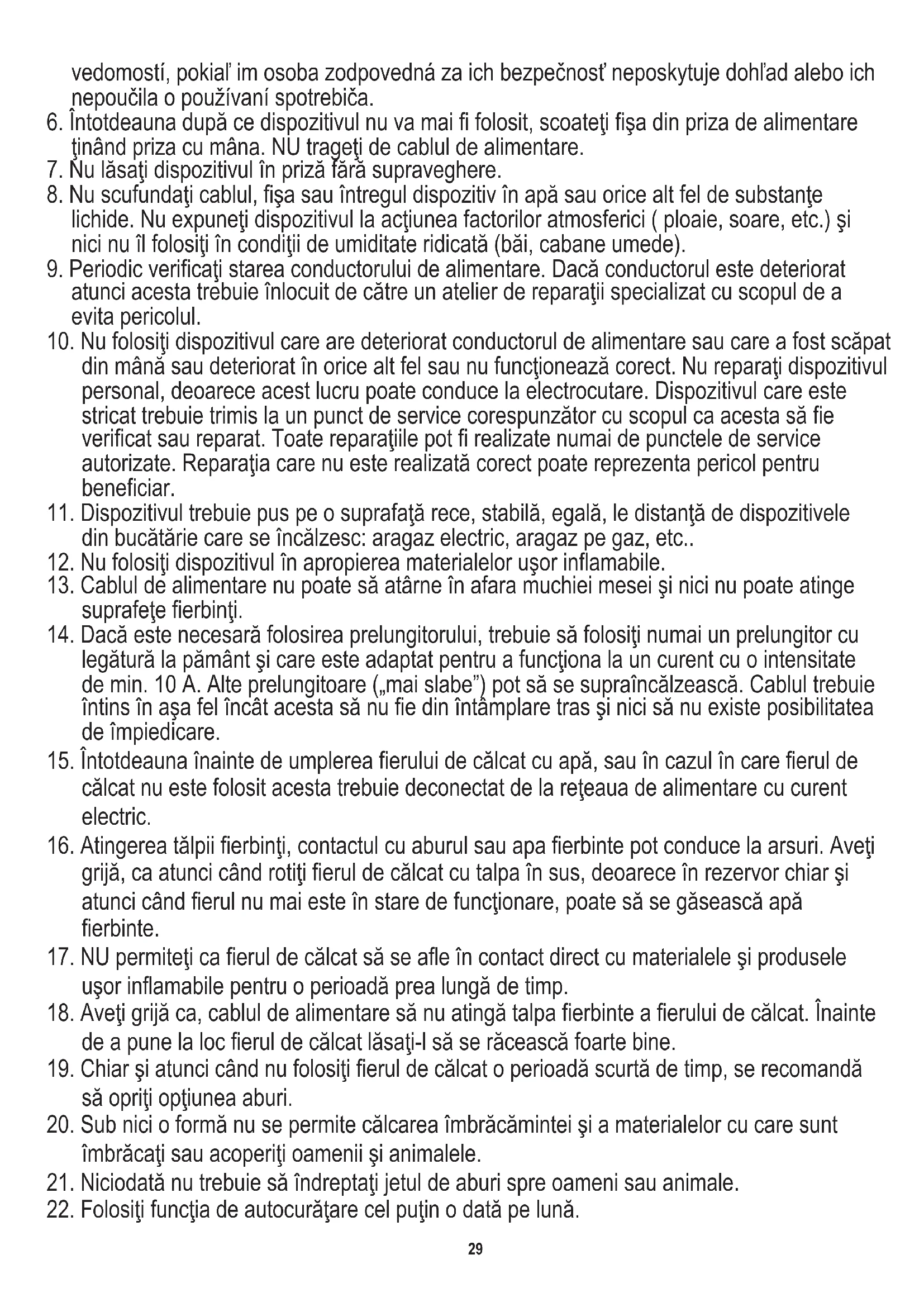 23. Fierul de călcat poate fi folosit numai pe suprafeţe stabile şi egale şi numai pe astfel de