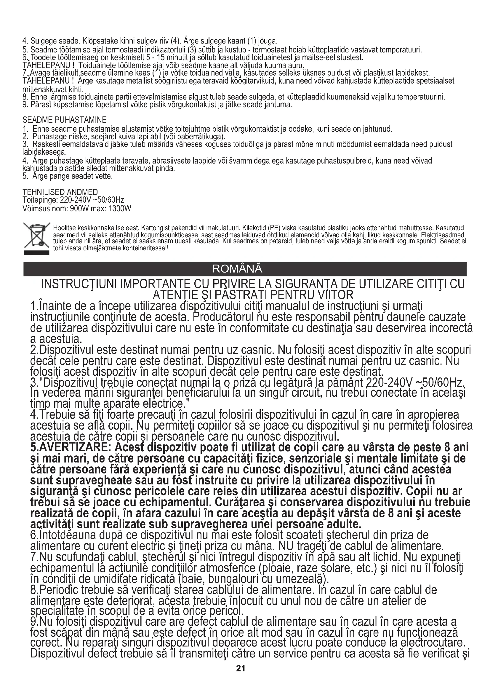 Toitepinge: 220-240V ~50/60Hz ROMÂNĂ Hoolitse keskkonnakaitse eest. Kartongist pakendid vii makulatuuri. Kilekotid (PE) viska kasutatud plastiku jaoks ettenähtud mahutitesse. Kasutatud seadmed vii selleks ettenähtud kogumispunktidesse, sest seadmes leiduvad ohtlikud elemendid võivad olla kahjulikud keskkonnale. Elektriseadmed tuleb anda nii ära, et seadet ei saaks enam uuesti kasutada. Kui seadmes on patareid, tuleb need välja võtta ja anda eraldi kogumispunkti. Seadet ei tohi visata olmejäätmete konteineritesse!! 8.Periodic trebuie să verificaţi starea cablului de alimentare. În cazul în care cablul de alimentare este deteriorat, acesta trebuie înlocuit cu unul nou de către un atelier de specialitate în scopul de a evita orice pericol. 7.Nu scufundaţi cablul, ştecherul şi nici întregul dispozitiv în apă sau alt lichid. Nu expuneţi echipamentul la acţiunile condiţiilor atmosferice (ploaie, raze solare, etc.) şi nici nu îl folosiţi în condiţii de umiditate ridicată (baie, bungalouri cu umezeală). 3."Dispozitivul trebuie conectat numai la o priză cu legătură la pământ 220-240V ~50/60Hz. 4.Trebuie să fiţi foarte precauţi în cazul folosirii dispozitivului în cazul în care în apropierea acestuia se află copii. Nu permiteţi copiilor să se joace cu dispozitivul şi nu permiteţi folosirea acestuia de către copii şi persoanele care nu cunosc dispozitivul. 9.Nu folosiţi dispozitivul care are defect cablul de alimentare sau în cazul în care acesta a fost scăpat din mână sau este defect în orice alt mod sau în cazul în care nu funcţionează corect. Nu reparaţi singuri dispozitivul deoarece acest lucru poate conduce la electrocutare. Dispozitivul defect trebuie să îl transmiteţi către un service pentru ca acesta să fie verificat şi 5.AVERTIZARE: Acest dispozitiv poate fi utilizat de copii care au vârsta de peste 8 ani şi mai mari, de către persoane cu capacităţi fizice, senzoriale şi mentale limitate şi de către persoane fără experienţă şi care nu cunosc dispozitivul, atunci când acestea sunt supravegheate sau au fost instruite cu privire la utilizarea dispozitivului în siguranţă şi cunosc pericolele care reies din utilizarea acestui dispozitiv. Copii nu ar trebui să se joace cu echipamentul. Curăţarea şi conservarea dispozitivului nu trebuie realizată de copii, în afara cazului în care aceştia au depăşit vârsta de 8 ani şi aceste activităţi sunt realizate sub supravegherea unei persoane adulte. 2.Dispozitivul este destinat numai pentru uz casnic. Nu folosiţi acest dispozitiv în alte scopuri decât cele pentru care este destinat. Dispozitivul este destinat numai pentru uz casnic. Nu folosiţi acest dispozitiv în alte scopuri decât cele pentru care este destinat. 6.Întotdeauna după ce dispozitivul nu mai este folosit scoateţi ştecherul din priza de alimentare cu curent electric şi ţineţi priza cu mâna. NU trageţi de cablul de alimentare. În vederea măririi siguranţei beneficiarului la un singur circuit, nu trebui conectate în acelaşi timp mai multe aparate electrice." 1.Înainte de a începe utilizarea dispozitivului citiţi manualul de instrucţiuni şi urmaţi instrucţiunile conţinute de acesta. Producătorul nu este responsabil pentru daunele cauzate de utilizarea dispozitivului care nu este în conformitate cu destinaţia sau deservirea incorectă a acestuia. INSTRUCŢIUNI IMPORTANTE CU PRIVIRE LA SIGURANŢA DE UTILIZARE CITIŢI CU ATENŢIE ŞI PĂSTRAŢI PENTRU VIITOR22