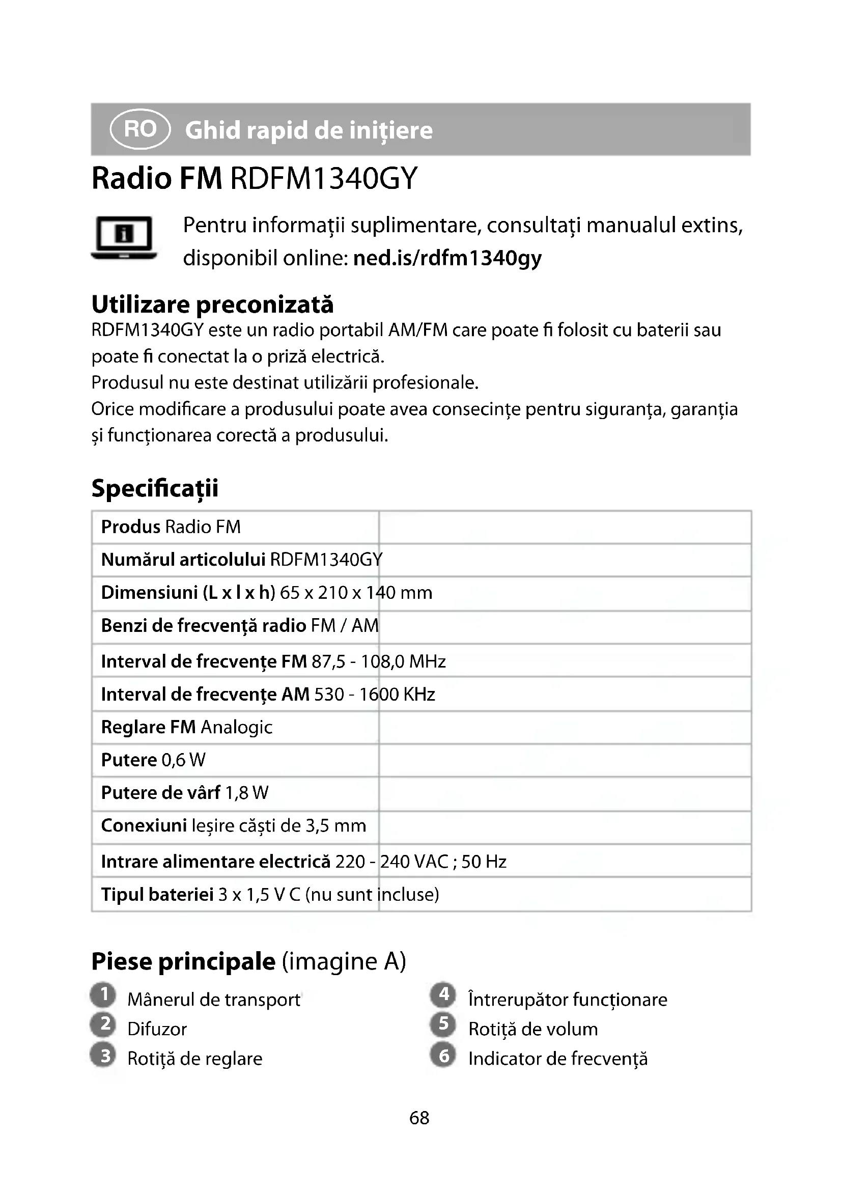 Ghid rapid de inițiere Radio FM RDFM1340GY Pentru informații suplimentare, consultați manualul extins, disponibil online: ned.is/rdfm1340gy Utilizare preconizată RDFM1340GY este un radio portabil AM/FM care poate folosit cu baterii sau poate conectat la o priză electrică. Produsul nu este destinat utilizării profesionale. Orice modicare a produsului poate avea consecințe pentru siguranța, garanția și funcționarea corectă a produsului. Specicaţii Produs Radio FM Numărul articolului RDFM1340GY Dimensiuni (L x l x h) 65 x 210 x 140 mm Benzi de frecvență radio FM / AM Interval de frecvențe FM 87,5 - 108,0 MHz Interval de frecvențe AM 530 - 1600 KHz Reglare FM Analogic Putere 0,6 W Putere de vârf 1,8 W Conexiuni Ieșire căști de 3,5 mm Intrare alimentare electrică 220 - 240 VAC ; 50 Hz Tipul bateriei 3 x 1,5 V C (nu sunt incluse) Piese principale (imagine A)