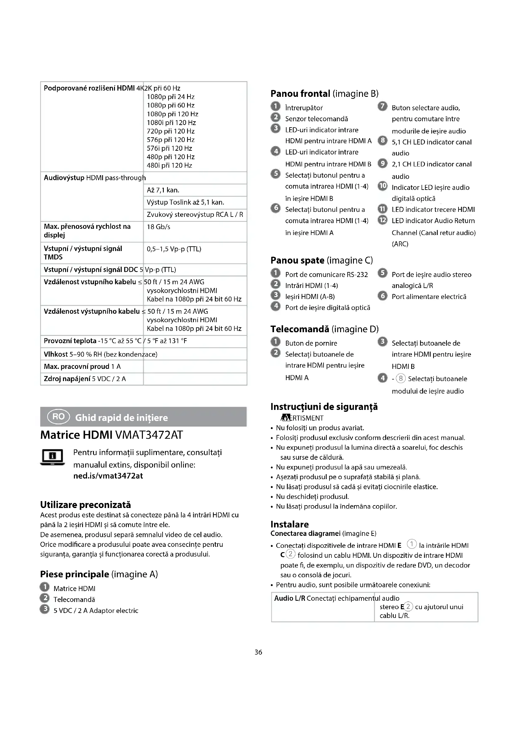 Ghid rapid de inițiere Matrice HDMI VMAT3472AT Pentru informații suplimentare, consultați manualul extins, disponibil online: ned.is/vmat3472at Utilizare preconizată Acest produs este destinat să conecteze până la 4 intrări HDMI cu până la 2 ieșiri HDMI și să comute între ele.De asemenea, produsul separă semnalul video de cel audio.Orice modicare a produsului poate avea consecințe pentru siguranța, garanția și funcționarea corectă a produsului. Piese principale (imagine A)