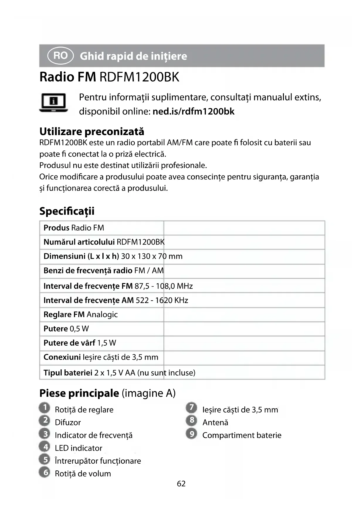 Ghid rapid de inițiere Radio FM RDFM1200BK Pentru informații suplimentare, consultați manualul extins, disponibil online: ned.is/rdfm1200bk Utilizare preconizată RDFM1200BK este un radio portabil AM/FM care poate folosit cu baterii sau poate conectat la o priză electrică. Produsul nu este destinat utilizării profesionale. Orice modicare a produsului poate avea consecințe pentru siguranța, garanția și funcționarea corectă a produsului. Specicaţii Produs Radio FM Numărul articolului RDFM1200BK Dimensiuni (L x l x h) 30 x 130 x 70 mm Benzi de frecvență radio FM / AM Interval de frecvențe FM 87,5 - 108,0 MHz Interval de frecvențe AM 522 - 1620 KHz Reglare FM Analogic Putere 0,5 W Putere de vârf 1,5 W Conexiuni Ieșire căști de 3,5 mm Tipul bateriei 2 x 1,5 V AA (nu sunt incluse) Piese principale (imagine A)