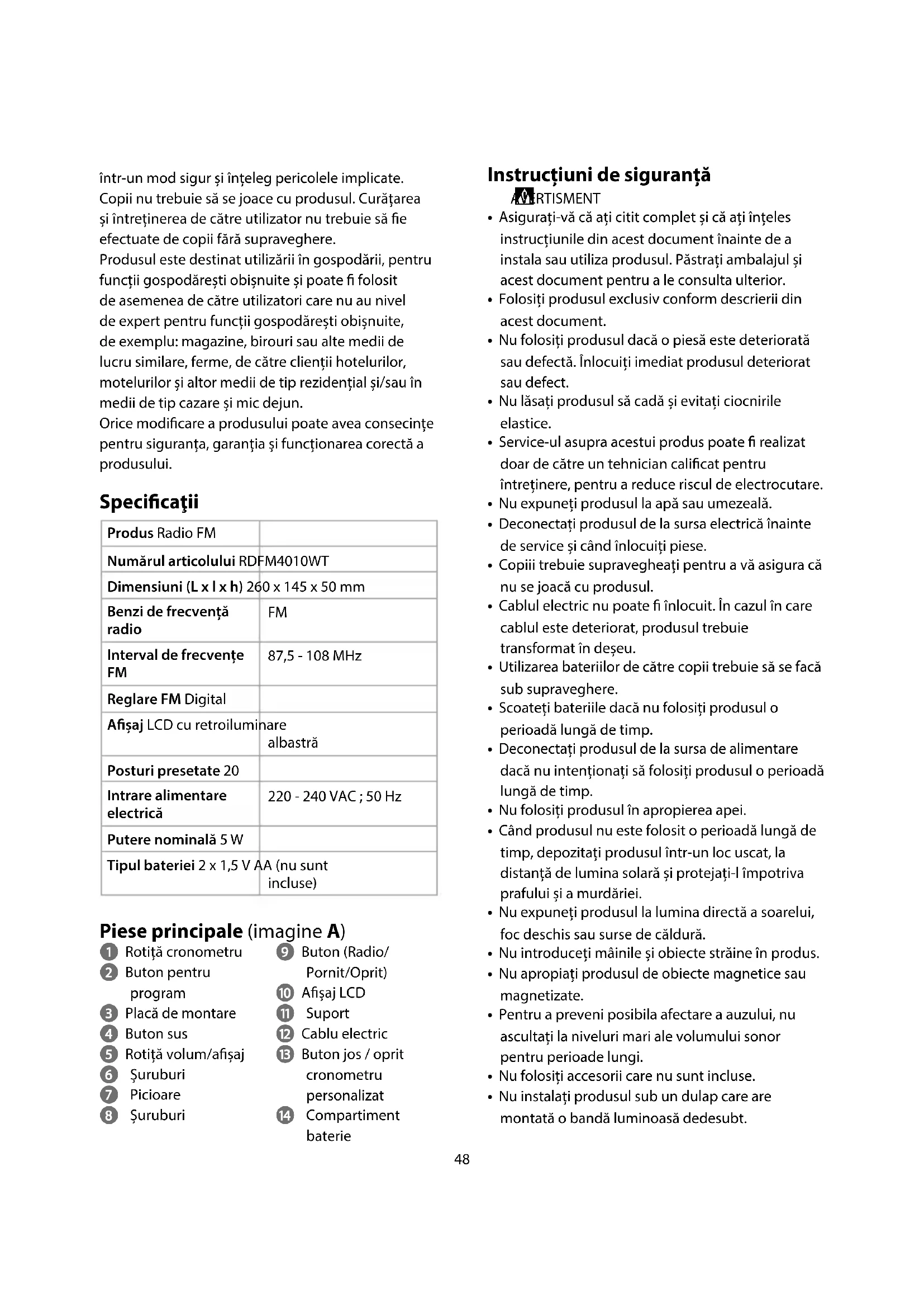 - Nu instalați produsul sub un dulap care are montată o bandă luminoasă dedesubt. într-un mod sigur și înțeleg pericolele implicate. Copii nu trebuie să se joace cu produsul. Curățarea și întreținerea de către utilizator nu trebuie să e efectuate de copii fără supraveghere. Produsul este destinat utilizării în gospodării, pentru funcții gospodărești obișnuite și poate folosit de asemenea de către utilizatori care nu au nivel de expert pentru funcții gospodărești obișnuite, de exemplu: magazine, birouri sau alte medii de lucru similare, ferme, de către clienții hotelurilor, motelurilor și altor medii de tip rezidențial și/sau în medii de tip cazare și mic dejun. Orice modicare a produsului poate avea consecințe pentru siguranța, garanția și funcționarea corectă a produsului. Specicaţii Produs Radio FM Numărul articolului RDFM4010WT Dimensiuni (L x l x h) 260 x 145 x 50 mm Benzi de frecvență radio