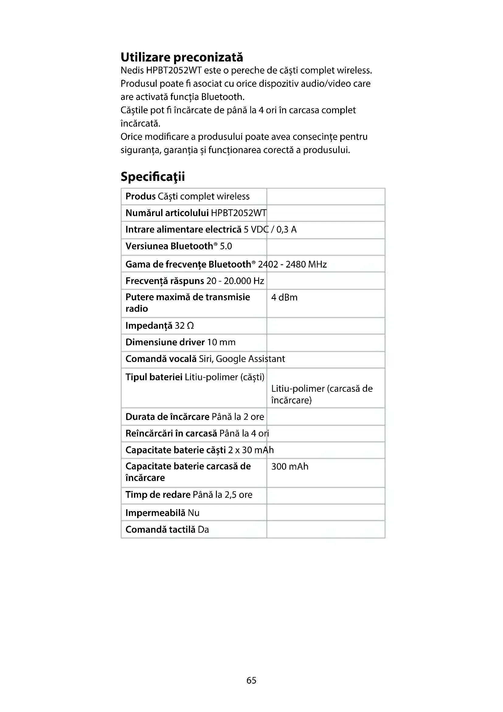 Ghid rapid de inițiere Căști complet wireless HPBT2052WT Pentru informații suplimentare, consultați manualul extins, disponibil online: ned.is/hpbt2052wt65 Utilizare preconizată Nedis HPBT2052WT este o pereche de căști complet wireless. Produsul poate asociat cu orice dispozitiv audio/video care are activată funcția Bluetooth. Căștile pot încărcate de până la 4 ori în carcasa complet încărcată. Orice modicare a produsului poate avea consecințe pentru siguranța, garanția și funcționarea corectă a produsului. Specicaţii Produs Căști complet wireless Numărul articolului HPBT2052WT Intrare alimentare electrică 5 VDC / 0,3 A Versiunea Bluetooth® 5.0 Gama de frecvențe Bluetooth® 2402 - 2480 MHz Frecvență răspuns 20 - 20.000 Hz Putere maximă de transmisie radio 4 dBm Impedanță 32 Ω Dimensiune driver 10 mm Comandă vocală Siri, Google Assistant Tipul bateriei Litiu-polimer (căști) Litiu-polimer (carcasă de încărcare) Durata de încărcare Până la 2 ore Reîncărcări în carcasă Până la 4 ori Capacitate baterie căști 2 x 30 mAh Capacitate baterie carcasă de încărcare 300 mAh Timp de redare Până la 2,5 ore Impermeabilă Nu Comandă tactilă Da66 Piese principale (imagine A)