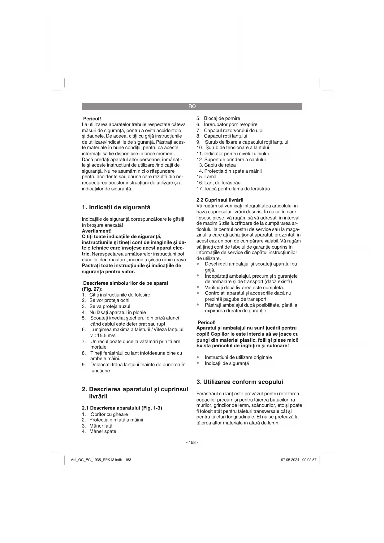 Ferăstrăul cu lanţ este prevăzut pentru retezarea copacilor precum şi pentru tăierea butucilor, ra- murilor, grinzilor de lemn, scândurilor, etc şi poate fi folosit atât pentru tăieturi transversale cât şi pentru tăieturi longitudinale. El nu se pretează la tăierea altor materiale în afară de lemn. Anl_GC_EC_1935_SPK13.indb 158Anl_GC_EC_1935_SPK13.indb 158 07.05.2024 09:02:5707.05.2024 09:02:57RO