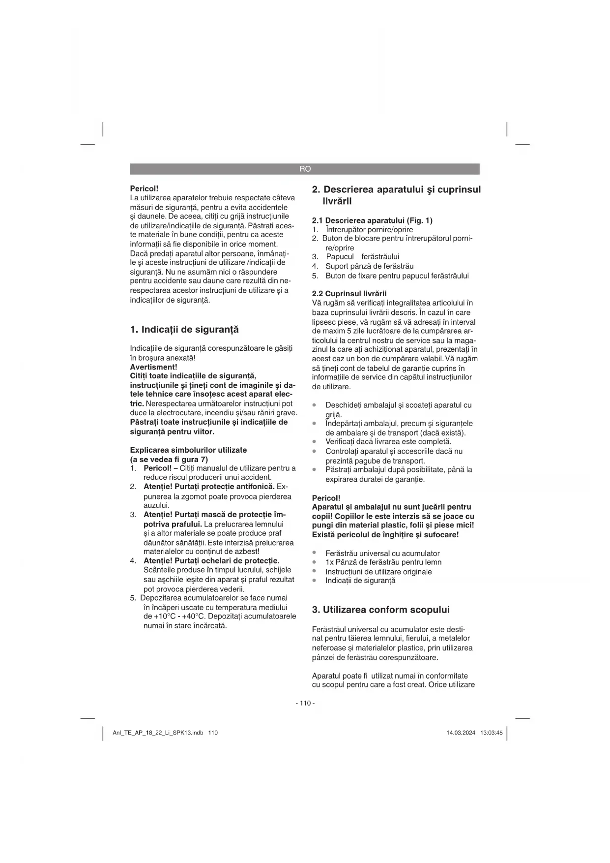 Ferăstrăul universal cu acumulator este desti- nat pentru tăierea lemnului, fi erului, a metalelor neferoase și materialelor plastice, prin utilizarea pânzei de ferăstrău corespunzătoare. Aparatul poate fi utilizat numai în conformitate cu scopul pentru care a fost creat. Orice utilizare Anl_TE_AP_18_22_Li_SPK13.indb 110Anl_TE_AP_18_22_Li_SPK13.indb 110 14.03.2024 13:03:4514.03.2024 13:03:45RO