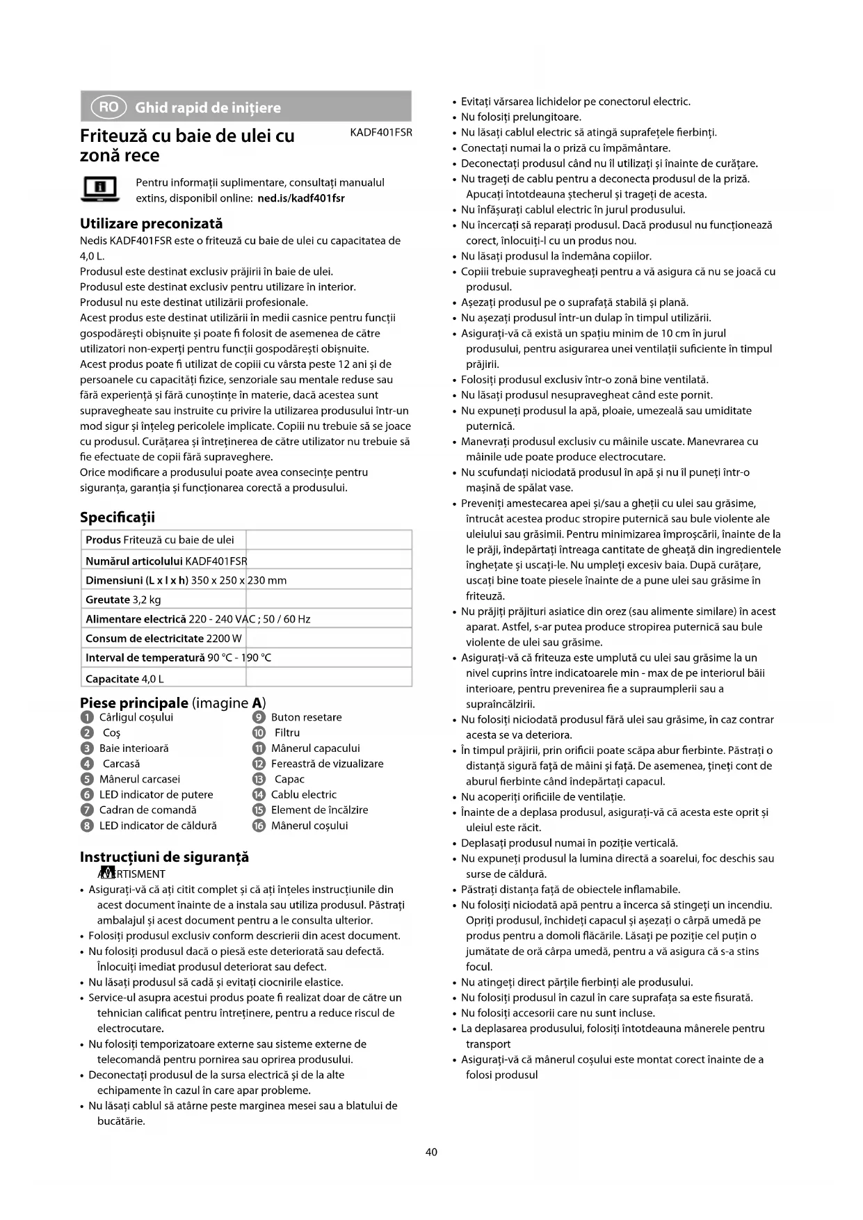 Ghid rapid de inițiere Friteuză cu baie de ulei cu zonă rece KADF401FSRPentru informații suplimentare, consultați manualul extins, disponibil online: ned.is/kadf401fsr Utilizare preconizată Nedis KADF401FSR este o friteuză cu baie de ulei cu capacitatea de 4,0 L.Produsul este destinat exclusiv prăjirii în baie de ulei.Produsul este destinat exclusiv pentru utilizare în interior.Produsul nu este destinat utilizării profesionale.Acest produs este destinat utilizării în medii casnice pentru funcții gospodărești obișnuite și poate folosit de asemenea de către utilizatori non-experți pentru funcții gospodărești obișnuite.Acest produs poate utilizat de copiii cu vârsta peste 12 ani și de persoanele cu capacități zice, senzoriale sau mentale reduse sau fără experiență și fără cunoștințe în materie, dacă acestea sunt supravegheate sau instruite cu privire la utilizarea produsului într-un mod sigur și înțeleg pericolele implicate. Copiii nu trebuie să se joace cu produsul. Curățarea și întreținerea de către utilizator nu trebuie să e efectuate de copii fără supraveghere.Orice modicare a produsului poate avea consecințe pentru siguranța, garanția și funcționarea corectă a produsului. Specicaţii Produs Friteuză cu baie de uleiNumărul articolului KADF401FSRDimensiuni (L x l x h) 350 x 250 x 230 mmGreutate 3,2 kgAlimentare electrică 220 - 240 VAC ; 50 / 60 HzConsum de electricitate 2200 WInterval de temperatură 90 °C - 190 °CCapacitate 4,0 L Piese principale (imagine A) 1 Cârligul coșului 2 Coş 3 Baie interioară 4 Carcasă 5 Mânerul carcasei 6 LED indicator de putere 7 Cadran de comandă 8 LED indicator de căldură 9 Buton resetare q Filtru w Mânerul capacului e Fereastră de vizualizare r Capac t Cablu electric y Element de încălzire u Mânerul coșului Instrucțiuni de siguranță