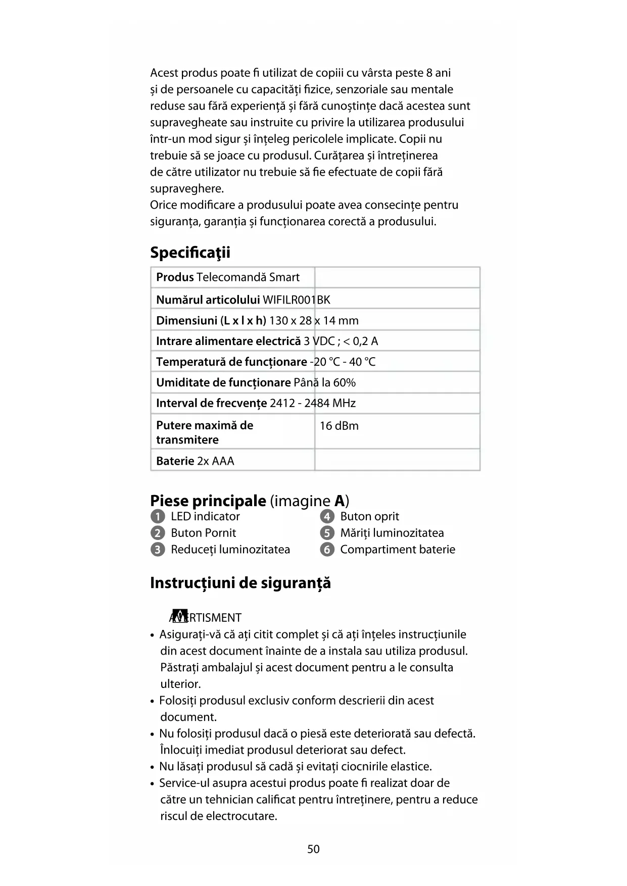 Ghid rapid de inițiere Telecomandă Smart WIFILR001BKPentru informații suplimentare, consultați manualul extins, disponibil online: ned.is/wilr001bk Utilizare preconizată Nedis WIFILR001BK este o telecomandă pentru a comanda mai multe becuri din seria WIFILRXXX.Produsul este destinat exclusiv pentru utilizare în interior.Produsul nu este destinat utilizării profesionale.Produsul este destinat utilizării în gospodării, pentru funcții gospodărești obișnuite și poate folosit de asemenea de către utilizatori care nu au nivel de expert pentru funcții gospodărești obișnuite, de exemplu: magazine, birouri sau alte medii de lucru similare, ferme, de către clienții hotelurilor, motelurilor și altor medii de tip rezidențial și/sau în medii de tip cazare și mic dejun.50 Acest produs poate utilizat de copiii cu vârsta peste 8 ani și de persoanele cu capacități zice, senzoriale sau mentale reduse sau fără experiență și fără cunoștințe dacă acestea sunt supravegheate sau instruite cu privire la utilizarea produsului într-un mod sigur și înțeleg pericolele implicate. Copii nu trebuie să se joace cu produsul. Curățarea și întreținerea de către utilizator nu trebuie să e efectuate de copii fără supraveghere. Orice modicare a produsului poate avea consecințe pentru siguranța, garanția și funcționarea corectă a produsului. Specicaţii Produs Telecomandă Smart Numărul articolului WIFILR001BK Dimensiuni (L x l x h) 130 x 28 x 14 mm Intrare alimentare electrică 3 VDC ; < 0,2 A Temperatură de funcționare -20 °C - 40 °C Umiditate de funcționare Până la 60% Interval de frecvențe 2412 - 2484 MHz Putere maximă de transmitere 16 dBm Baterie 2x AAA Piese principale (imagine A) 1 LED indicator 2 Buton Pornit 3 Reduceți luminozitatea 4 Buton oprit 5 Măriți luminozitatea 6 Compartiment baterie Instrucțiuni de siguranță