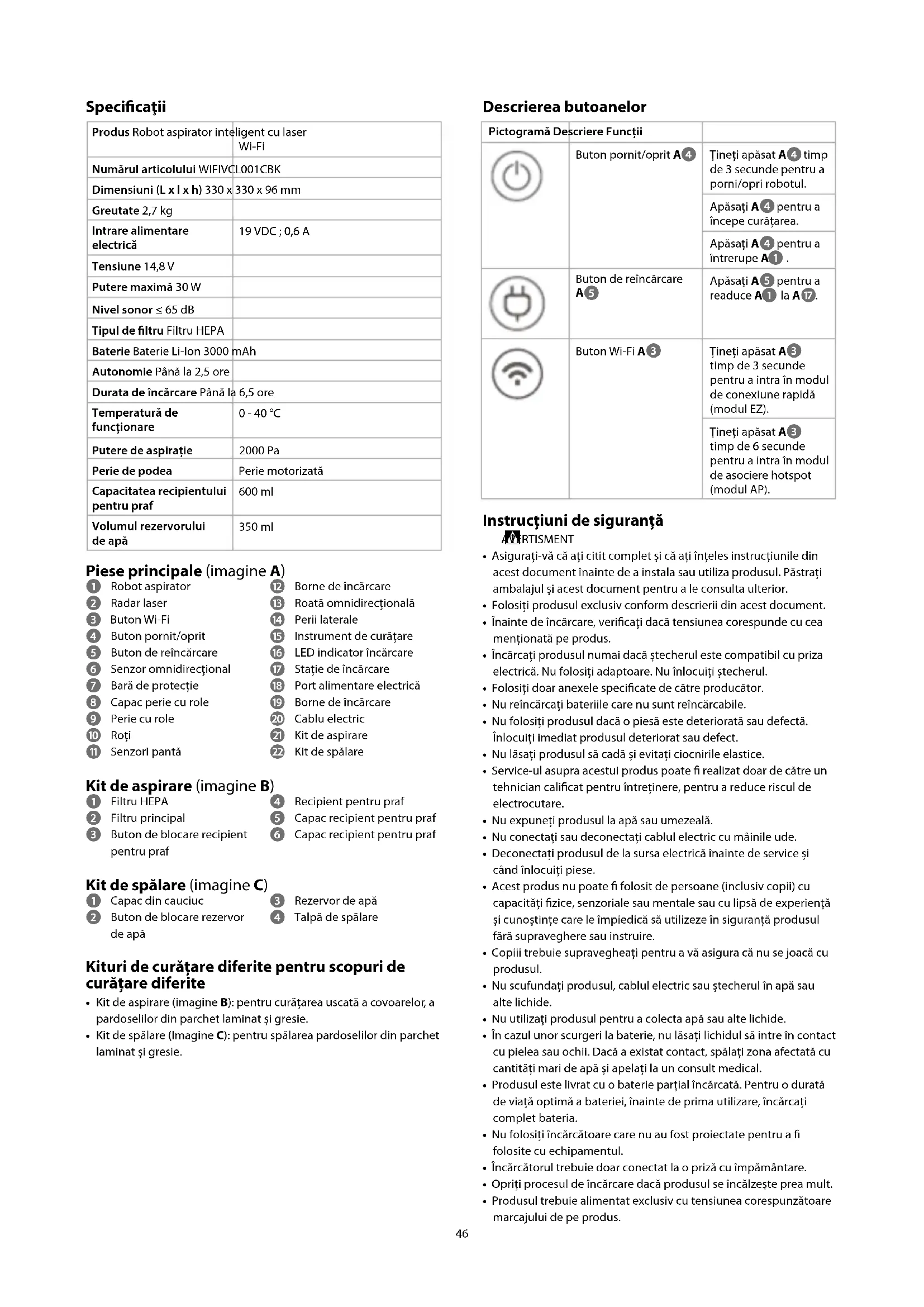 - Produsul trebuie alimentat exclusiv cu tensiunea corespunzătoare marcajului de pe produs. Specicaţii Produs Robot aspirator inteligent cu laser Wi-Fi Numărul articolului WIFIVCL001CBK Dimensiuni (L x l x h) 330 x 330 x 96 mm Greutate 2,7 kg Intrare alimentare electrică 19 VDC ; 0,6 A Tensiune 14,8 V Putere maximă 30 W Nivel sonor ≤ 65 dB Tipul de ltru Filtru HEPA Baterie Baterie Li-Ion 3000 mAh Autonomie Până la 2,5 ore Durata de încărcare Până la 6,5 ore Temperatură de funcționare