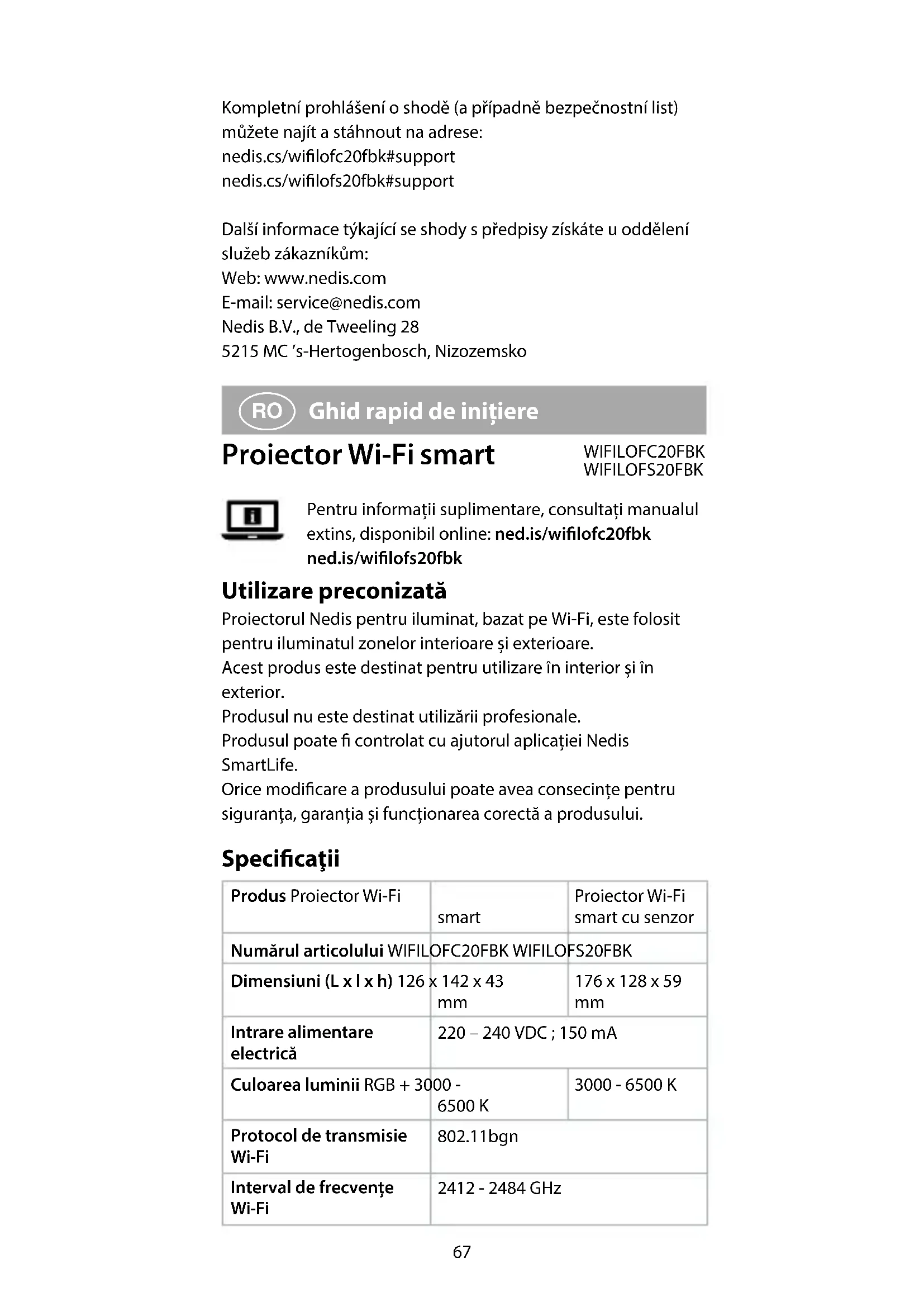 Ghid rapid de inițiere Proiector Wi-Fi smart WIFILOFC20FBK WIFILOFS20FBK Pentru informații suplimentare, consultați manualul extins, disponibil online: ned.is/wilofc20fbk ned.is/wilofs20fbk Utilizare preconizată Proiectorul Nedis pentru iluminat, bazat pe Wi-Fi, este folosit pentru iluminatul zonelor interioare și exterioare. Acest produs este destinat pentru utilizare în interior și în exterior. Produsul nu este destinat utilizării profesionale. Produsul poate controlat cu ajutorul aplicației Nedis SmartLife. Orice modicare a produsului poate avea consecințe pentru siguranța, garanția și funcționarea corectă a produsului. Specicaţii Produs Proiector Wi-Fi smart Proiector Wi-Fi smart cu senzor Numărul articolului WIFILOFC20FBK WIFILOFS20FBK Dimensiuni (L x l x h) 126 x 142 x 43