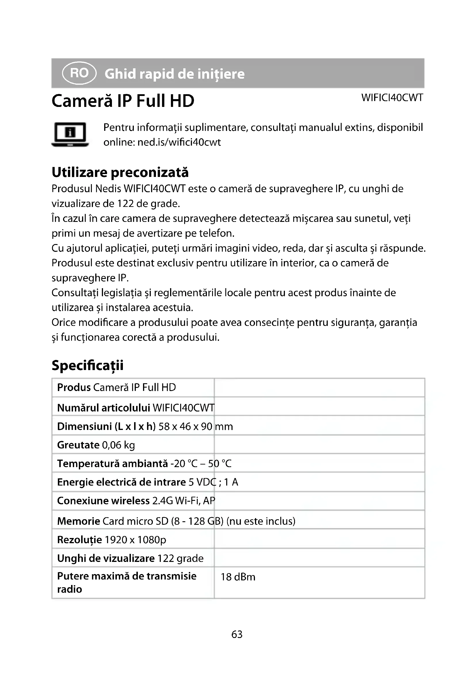 Ghid rapid de inițiere Cameră IP Full HD WIFICI40CWT Pentru informații suplimentare, consultați manualul extins, disponibil online: ned.is/wici40cwt Utilizare preconizată Produsul Nedis WIFICI40CWT este o cameră de supraveghere IP, cu unghi de vizualizare de 122 de grade. În cazul în care camera de supraveghere detectează mișcarea sau sunetul, veți primi un mesaj de avertizare pe telefon. Cu ajutorul aplicației, puteți urmări imagini video, reda, dar și asculta și răspunde. Produsul este destinat exclusiv pentru utilizare în interior, ca o cameră de supraveghere IP. Consultați legislația și reglementările locale pentru acest produs înainte de utilizarea și instalarea acestuia. Orice modicare a produsului poate avea consecințe pentru siguranța, garanția și funcționarea corectă a produsului. Specicaţii Produs Cameră IP Full HD Numărul articolului WIFICI40CWT Dimensiuni (L x l x h) 58 x 46 x 90 mm Greutate 0,06 kg Temperatură ambiantă -20 °C – 50 °C Energie electrică de intrare 5 VDC ; 1 A Conexiune wireless 2.4G Wi-Fi, AP Memorie Card micro SD (8 - 128 GB) (nu este inclus) Rezoluție 1920 x 1080p Unghi de vizualizare 122 grade Putere maximă de transmisie radio 18 dBm64 Câștig antenă 2 dBi Interval de frecvențe 2412 - 2472 MHz Piese principale (imagine A) 1 LED indicator de stare 2 Lentila camerei 3 Microfon 4 Buton resetare 5 Fantă card micro SD 6 Difuzor 7 Port micro USB 8 Adaptor electric USB 9 Ac pentru resetare q Cablu micro USB Instrucțiuni de siguranță