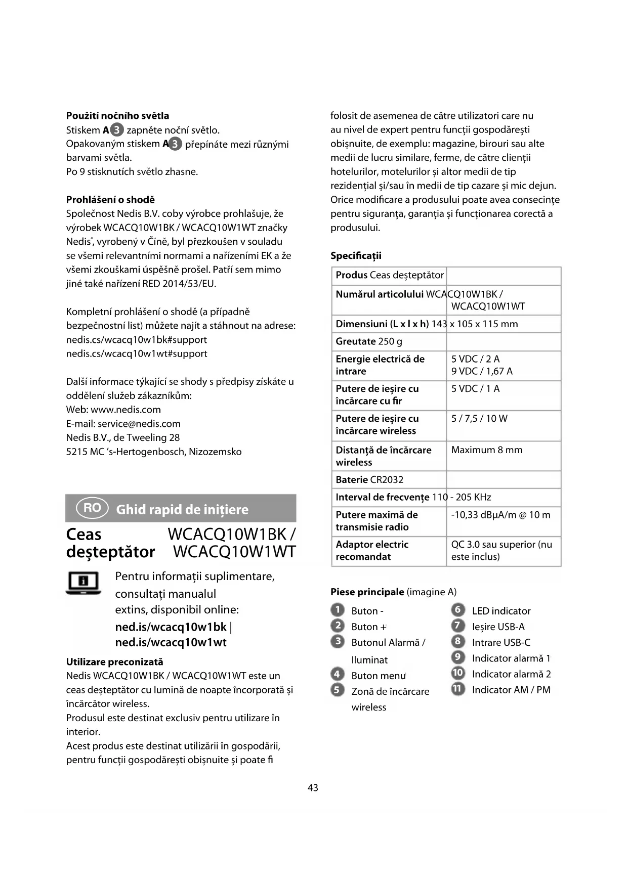 Pentru informații suplimentare, consultați manualul extins, disponibil online: ned.is/wcacq10w1bk | ned.is/wcacq10w1wt Utilizare preconizată Nedis WCACQ10W1BK / WCACQ10W1WT este un ceas deșteptător cu lumină de noapte încorporată și încărcător wireless. Produsul este destinat exclusiv pentru utilizare în interior. Acest produs este destinat utilizării în gospodării, pentru funcții gospodărești obișnuite și poate WCACQ10W1BK_WCACQ10W1WT_MAN_COMP_0520_QSG_(20257 1422)_v1.0.indd 43 26/05/2020 10:59:0744