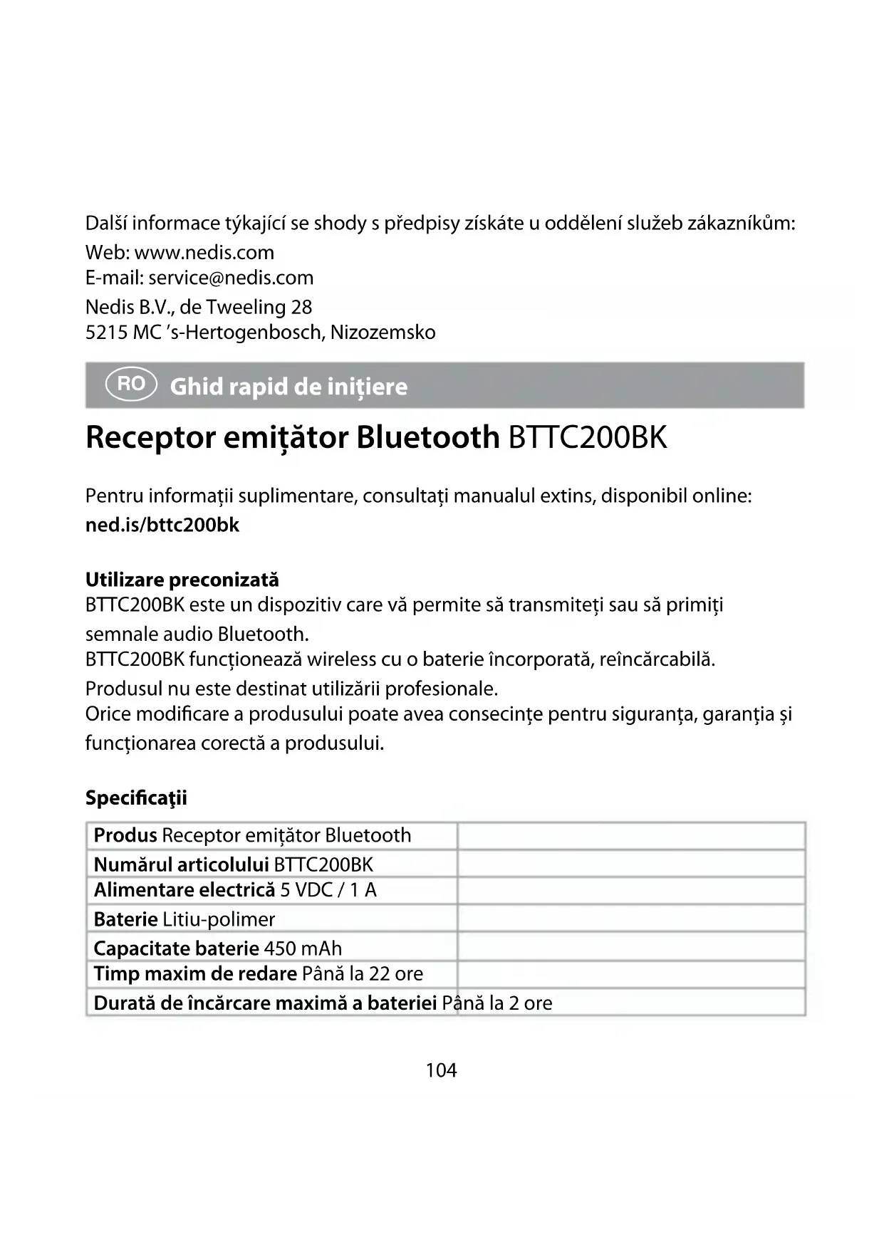 Ghid rapid de inițiere Receptor emițător Bluetooth BTTC200BK Pentru informații suplimentare, consultați manualul extins, disponibil online: ned.is/bttc200bk Utilizare preconizată BTTC200BK este un dispozitiv care vă permite să transmiteți sau să primiți semnale audio Bluetooth. BTTC200BK funcționează wireless cu o baterie încorporată, reîncărcabilă. Produsul nu este destinat utilizării profesionale. Orice modificare a produsului poate avea consecințe pentru siguranța, garanția și funcționarea corectă a produsului. Specicaţii Produs Receptor emițător Bluetooth Numărul articolului BTTC200BK Alimentare electrică 5 VDC / 1 A Baterie Litiu-polimer Capacitate baterie 450 mAh Timp maxim de redare Până la 22 ore Durată de încărcare maximă a bateriei Până la 2 ore105 Timpul de așteptare Până la 48 ore Versiunea Bluetooth® 5.0 Putere maximă de transmisie 1,31 dBm Gama de frecvențe Bluetooth 2402 - 2480 MHz Gama de semnal Bluetooth Până la 10 metri Proluri Bluetooth A2DP Codecs acceptat SBC / aptX