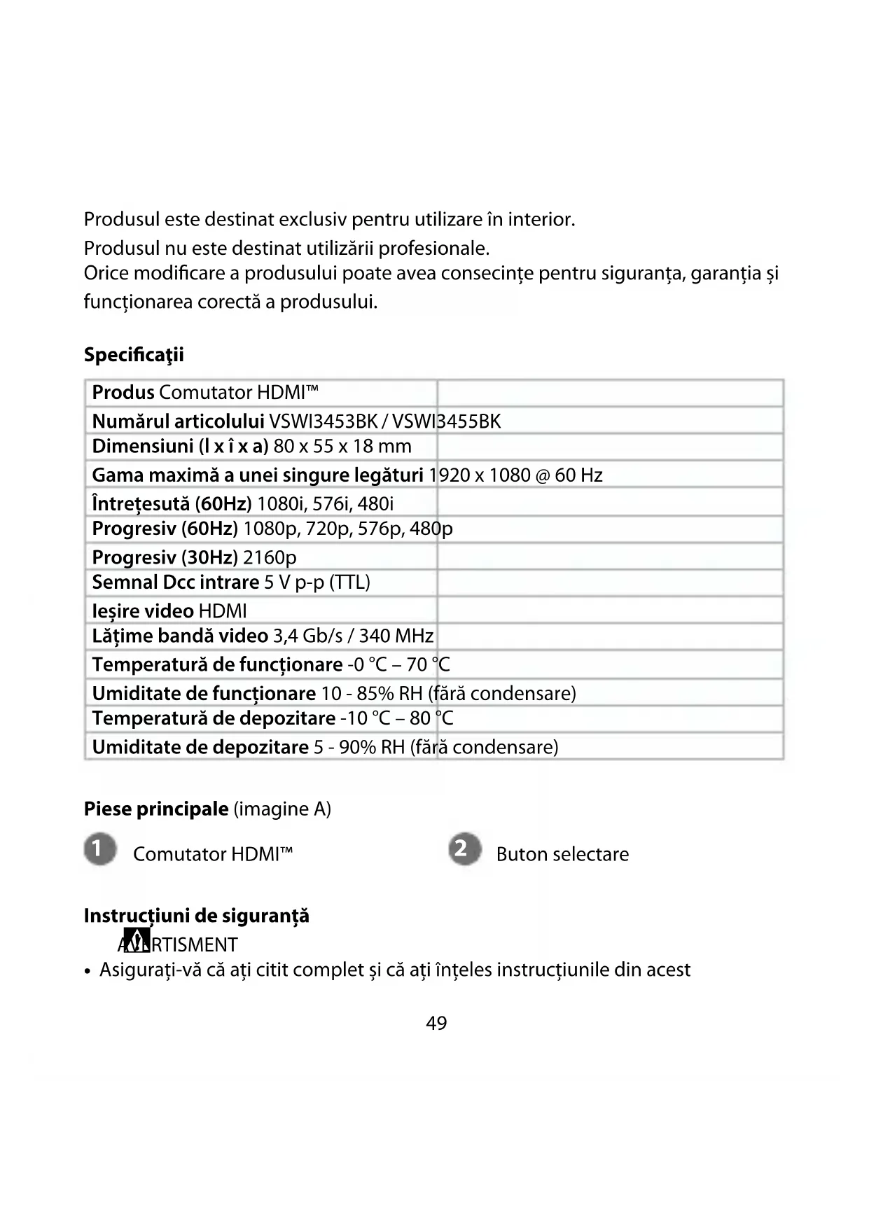 Pentru informații suplimentare, consultați manualul extins, disponibil online: ned.is/vswi3453bk | ned.is/vswi3455bk Utilizare preconizată Acest produs este destinat exclusiv comutării surselor multiple HDMI la 1 monitor sau proiector HD.49 Produsul este destinat exclusiv pentru utilizare în interior. Produsul nu este destinat utilizării profesionale. Orice modificare a produsului poate avea consecințe pentru siguranța, garanția și funcționarea corectă a produsului. Specicaţii Produs Comutator HDMI™ Numărul articolului VSWI3453BK / VSWI3455BK Dimensiuni (l x î x a) 80 x 55 x 18 mm Gama maximă a unei singure legături 1920 x 1080 @ 60 Hz Întrețesută (60Hz) 1080i, 576i, 480i Progresiv (60Hz) 1080p, 720p, 576p, 480p Progresiv (30Hz) 2160p Semnal Dcc intrare 5 V p-p (TTL) Ieșire video HDMI Lățime bandă video 3,4 Gb/s / 340 MHz Temperatură de funcționare -0 °C – 70 °C Umiditate de funcționare 10 - 85% RH (fără condensare) Temperatură de depozitare -10 °C – 80 °C Umiditate de depozitare 5 - 90% RH (fără condensare) Piese principale (imagine A)
