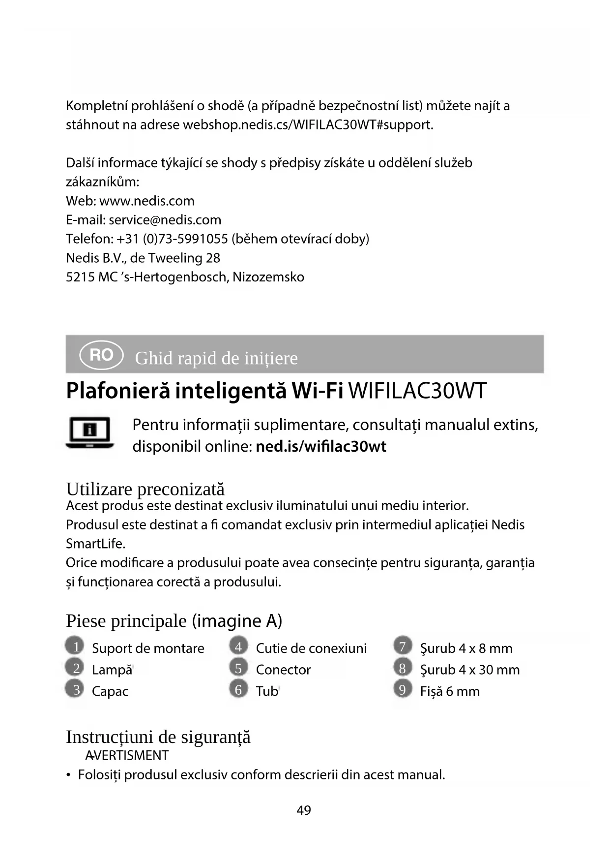 Ghid rapid de inițiere Plafonieră inteligentă Wi-Fi WIFILAC30WT Pentru informații suplimentare, consultați manualul extins, disponibil online: ned.is/wilac30wt Utilizare preconizată Acest produs este destinat exclusiv iluminatului unui mediu interior.Produsul este destinat a comandat exclusiv prin intermediul aplicației Nedis SmartLife.Orice modicare a produsului poate avea consecințe pentru siguranța, garanția și funcționarea corectă a produsului. Piese principale (imagine A)