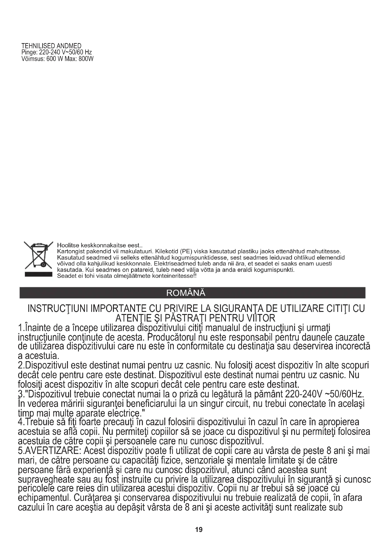 Hoolitse keskkonnakaitse eest.. Kartongist pakendid vii makulatuuri. Kilekotid (PE) viska kasutatud plastiku jaoks ettenähtud mahutitesse. Kasutatud seadmed vii selleks ettenähtud kogumispunktidesse, sest seadmes leiduvad ohtlikud elemendid võivad olla kahjulikud keskkonnale. Elektriseadmed tuleb anda nii ära, et seadet ei saaks enam uuesti kasutada. Kui seadmes on patareid, tuleb need välja võtta ja anda eraldi kogumispunkti. Seadet ei tohi visata olmejäätmete konteineritesse!! ROMÂNĂ TEHNILISED ANDMED Pinge: 220-240 V~50/60 Hz Võimsus: 600 W Max: 800W INSTRUCŢIUNI IMPORTANTE CU PRIVIRE LA SIGURANŢA DE UTILIZARE CITIŢI CU ATENŢIE ŞI PĂSTRAŢI PENTRU VIITOR 1.Înainte de a începe utilizarea dispozitivului citiţi manualul de instrucţiuni şi urmaţi instrucţiunile conţinute de acesta. Producătorul nu este responsabil pentru daunele cauzate de utilizarea dispozitivului care nu este în conformitate cu destinaţia sau deservirea incorectă a acestuia. 2.Dispozitivul este destinat numai pentru uz casnic. Nu folosiţi acest dispozitiv în alte scopuri decât cele pentru care este destinat. Dispozitivul este destinat numai pentru uz casnic. Nu folosiţi acest dispozitiv în alte scopuri decât cele pentru care este destinat. 3."Dispozitivul trebuie conectat numai la o priză cu legătură la pământ 220-240V ~50/60Hz. În vederea măririi siguranţei beneficiarului la un singur circuit, nu trebui conectate în acelaşi timp mai multe aparate electrice." 4.Trebuie să fiţi foarte precauţi în cazul folosirii dispozitivului în cazul în care în apropierea acestuia se află copii. Nu permiteţi copiilor să se joace cu dispozitivul şi nu permiteţi folosirea acestuia de către copii şi persoanele care nu cunosc dispozitivul. 5.AVERTIZARE: Acest dispozitiv poate fi utilizat de copii care au vârsta de peste 8 ani şi mai mari, de către persoane cu capacităţi fizice, senzoriale şi mentale limitate şi de către persoane fără experienţă şi care nu cunosc dispozitivul, atunci când acestea sunt supravegheate sau au fost instruite cu privire la utilizarea dispozitivului în siguranţă şi cunosc pericolele care reies din utilizarea acestui dispozitiv. Copii nu ar trebui să se joace cu echipamentul. Curăţarea şi conservarea dispozitivului nu trebuie realizată de copii, în afara cazului în care aceştia au depăşit vârsta de 8 ani şi aceste activităţi sunt realizate sub20 supravegherea unei persoane adulte. 6.Întotdeauna după ce dispozitivul nu mai este folosit scoateţi ştecherul din priza de alimentare cu curent electric şi ţineţi priza cu mâna. NU trageţi de cablul de alimentare. 7.Nu scufundaţi cablul, ştecherul şi nici întregul dispozitiv în apă sau alt lichid. Nu expuneţi echipamentul la acţiunile condiţiilor atmosferice (ploaie, raze solare, etc.) şi nici nu îl folosiţi în condiţii de umiditate ridicată (baie, bungalouri cu umezeală). 8.Periodic trebuie să verificaţi starea cablului de alimentare. În cazul în care cablul de alimentare este deteriorat, acesta trebuie înlocuit cu unul nou de către un atelier de specialitate în scopul de a evita orice pericol. 9.Nu folosiţi dispozitivul care are defect cablul de alimentare sau în cazul în care acesta a fost scăpat din mână sau este defect în orice alt mod sau în cazul în care nu funcţionează corect. Nu reparaţi singuri dispozitivul deoarece acest lucru poate conduce la electrocutare. Dispozitivul defect trebuie să îl transmiteţi către un service pentru ca acesta să fie verificat şi în caz de nevoie reparat. Toate reparaţiile pot fi efectuate numai de către punctele de service care posedă autorizaţie. Reparaţia care nu este realizată incorect poate cauza pericol grav pentru beneficiar. 10.Dispozitivul trebuie amplasat pe o suprafaţă stabilă, netedă, departe de dispozitivele de bucătărie care redau căldură, aşa cum ar fi: aragazul electric şi cel pe gaz etc. 11.Nu folosiţi dispozitivul în apropierea materialelor combustibile. 12.Cablul de alimentare nu poate să atârne peste marginea mesei sau să atingă suprafeţele fierbinţi. 13.Nu se permite lăsarea dispozitivului pornit şi nici a alimentatorului în priză fără supraveghere. 14.Pentru a asigura o protecţie suplimentară, se recomandă instalarea pe circuitul electric a unui dispozitiv cu curent diferenţial (RCD) cu curent alternativ diferenţial care nu va depăşi 30 mA. În acest sens trebuie să vă adresaţi unui electrician specialist.