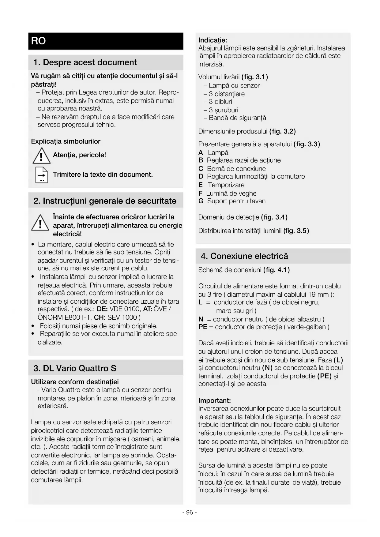 Utilizare conform destinaţiei – Vario Quattro este o lampă cu senzor pentru montarea pe plafon în zona interioară şi în zona exterioară. Lampa cu senzor este echipată cu patru senzori piroelectrici care detectează radiaţiile termice invizibile ale corpurilor în mişcare ( oameni, animale, etc. ). Aceste radiaţii termice înregistrate sunt convertite electronic, iar lampa se aprinde. Obsta- colele, cum ar fi zidurile sau geamurile, se opun detectării radiaţiilor termice, nefăcând deci posibilă comutarea lămpii.