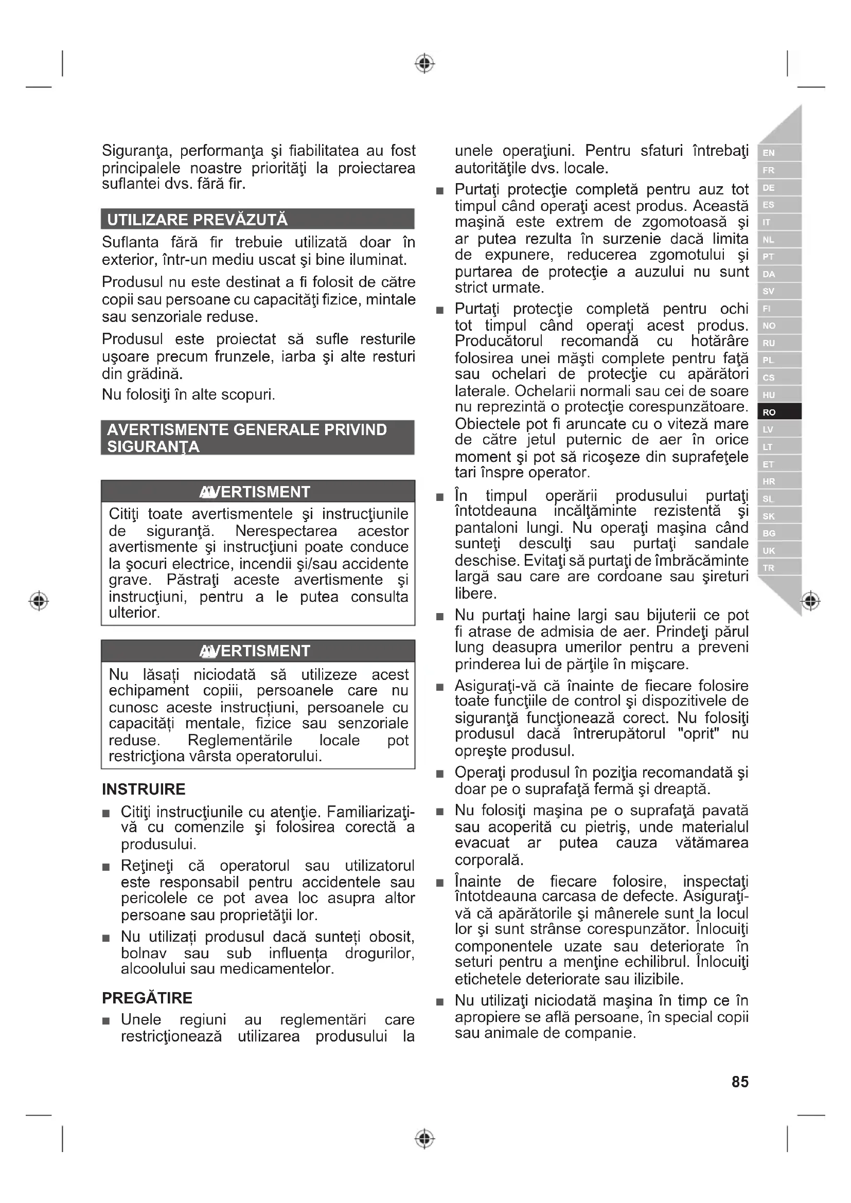 SIGURANŢA AVERTISMENT Citiţi toate avertismentele şi instrucţiunile de siguranţă. Nerespectarea acestor avertismente şi instrucţiuni poate conduce la şocuri electrice, incendii şi/sau accidente grave. Păstraţi aceste avertismente şi instrucţiuni, pentru a le putea consulta ulterior. AVERTISMENT Nu lăsați niciodată să utilizeze acest echipament copiii, persoanele care nu cunosc aceste instrucțiuni, persoanele cu capacități mentale, fi zice sau senzoriale reduse. Reglementările locale pot restricţiona vârsta operatorului. INSTRUIRE ■ Citiţi instrucţiunile cu atenţie. Familiarizaţi- vă cu comenzile şi folosirea corectă a produsului. ■ Reţineţi că operatorul sau utilizatorul este responsabil pentru accidentele sau pericolele ce pot avea loc asupra altor persoane sau proprietăţii lor. ■ Nu utilizați produsul dacă sunteți obosit, bolnav sau sub influența drogurilor, alcoolului sau medicamentelor. PREGĂTIRE ■ Unele regiuni au reglementări care restricţionează utilizarea produsului la unele operaţiuni. Pentru sfaturi întrebaţi autorităţile dvs. locale. ■ Purtaţi protecţie completă pentru auz tot timpul când operaţi acest produs. Această maşină este extrem de zgomotoasă şi ar putea rezulta în surzenie dacă limita de expunere, reducerea zgomotului şi purtarea de protecţie a auzului nu sunt strict urmate. ■ Purtaţi protecţie completă pentru ochi tot timpul când operaţi acest produs. Producătorul recomandă cu hotărâre folosirea unei măşti complete pentru faţă sau ochelari de protecţie cu apărători laterale. Ochelarii normali sau cei de soare nu reprezintă o protecţie corespunzătoare. Obiectele pot fi aruncate cu o viteză mare de către jetul puternic de aer în orice moment şi pot să ricoşeze din suprafeţele tari înspre operator. ■ În timpul operării produsului purtaţi întotdeauna incălţăminte rezistentă şi pantaloni lungi. Nu operaţi maşina când sunteţi desculţi sau purtaţi sandale deschise. Evitaţi să purtaţi de îmbrăcăminte largă sau care are cordoane sau şireturi libere. ■ Nu purtaţi haine largi sau bijuterii ce pot fi atrase de admisia de aer. Prindeţi părul lung deasupra umerilor pentru a preveni prinderea lui de părţile în mişcare. ■ Asiguraţi-vă că înainte de fiecare folosire toate funcţiile de control şi dispozitivele de siguranţă funcţionează corect. Nu folosiţi produsul dacă întrerupătorul "oprit" nu opreşte produsul. ■ Operaţi produsul în poziţia recomandată şi doar pe o suprafaţă fermă şi dreaptă. ■ Nu folosiţi maşina pe o suprafaţă pavată sau acoperită cu pietriş, unde materialul evacuat ar putea cauza vătămarea corporală. ■ Înainte de fiecare folosire, inspectaţi întotdeauna carcasa de defecte. Asiguraţi- vă că apărătorile şi mânerele sunt la locul lor şi sunt strânse corespunzător. Înlocuiţi componentele uzate sau deteriorate în seturi pentru a menţine echilibrul. Înlocuiţi etichetele deteriorate sau ilizibile. ■ Nu utilizaţi niciodată maşina în timp ce în apropiere se află persoane, în special copii sau animale de companie.86 | Română
