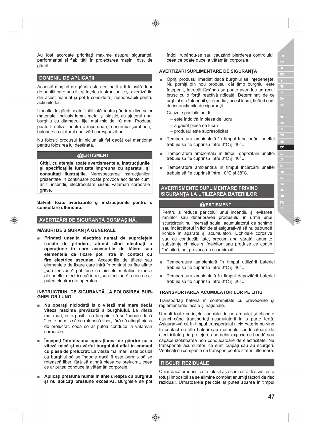 Acaestă maşină de găurit este destinată a fi folosită doar de adulţii care au citit şi înţeles instrucţiunile şi avertizările din acest manual şi pot fi consideraţi responsabili pentru acţiunile lor. Unealta de găurit poate fi utilizată pentru găurirea diverselor materiale, inclusiv lemn, metal şi plastic, cu ajutorul unul burghiu cu diametrul tijei mai mic de 10 mm. Produsul poate fi utilizat pentru a înșuruba și deșuruba șuruburi și buloane cu ajutorul unui vârf corespunzător. Nu folosiţi produsul în niciun alt fel decât cel menţionat pentru folosirea lui destinată. AVERTISMENT Citiţi, cu atenţie, toate avertismentele, instrucţiunile şi specificaţiile furnizate împreună cu aparatul, şi consultaţi ilustraţiile. Nerespectarea instrucţiunilor prezentate în continuare poate provoca accidente cum ar fi incendii, electrocutare şi/sau vătămări corporale grave. Salvaţi toate avertizările şi instrucţiunile pentru o consultare ulterioară. AVERTIZĂRI DE SIGURANŢĂ BORMAŞINĂ.