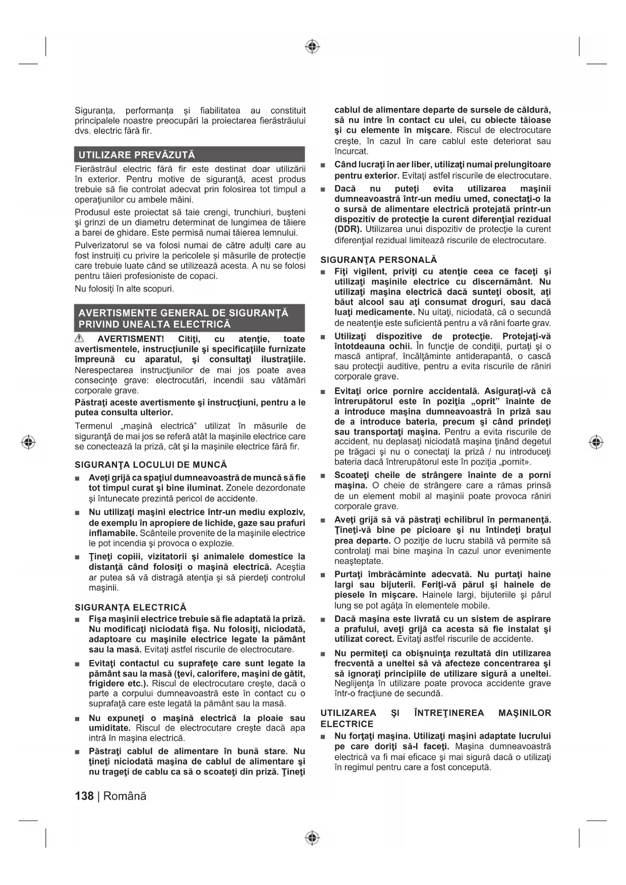 AVERTISMENT! Citiţi, cu atenţie, toate avertismentele, instrucţiunile şi specificaţiile furnizate împreună cu aparatul, şi consultaţi ilustraţiile. Nerespectarea instrucţiunilor de mai jos poate avea consecinţe grave: electrocutări, incendii sau vătămări corporale grave. Păstraţi aceste avertismente şi instrucţiuni, pentru a le putea consulta ulterior. Termenul „maşină electrică” utilizat în măsurile de siguranţă de mai jos se referă atât la maşinile electrice care se conectează la priză, cât şi la maşinile electrice fără fi r.