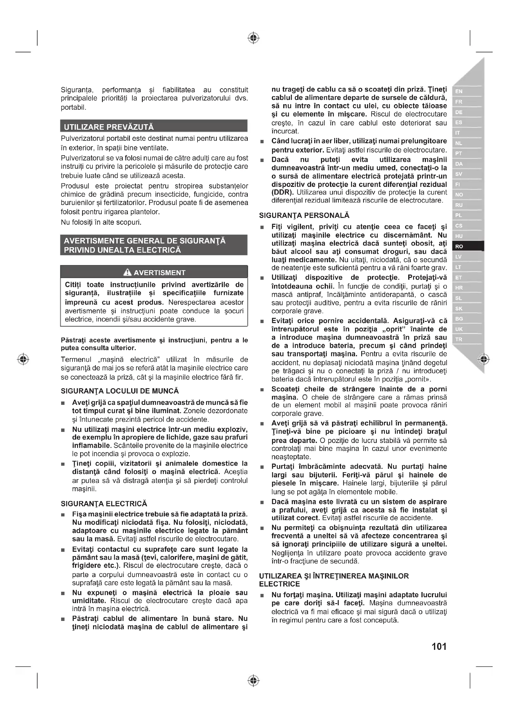 ■ Nu lăsaţi niciodată copiii, persoanele cu capacităţi fizice, senzoriale sau mintale reduse sau cu lipsă de experienţă şi cunoştinţe sau persoanele nefamiliarizate cu aceste instrucţiuni să folosească produsul. ■ Păstrați zona liberă de privitori, copii și animale de companie în timpul stropirii. ■ Fiți atent la orice pericole prezentate pe materialele de stropire. Înainte de folosirea oricărui pesticid sau alte materiale de stropit cu produsul, citiți cu atenție eticheta pe recipientul original și urmați instrucțiunile. ■ Asigurați-vă că vergeaua de stropit este conectată fix la mânerul vergelei de stropit înainte de a folosi produsul. Dacă e necesar, folosiți cleștele pentru a atașa vergeaua de stropit la mânerul vergelei de stropit. ■ Amintiți-vă să înlocuiți și strîngeți corespunzător capacul rezervorului de stropit după ce ați turnat lichid în rezervor. ■ Folosiți substanțe chimice comerciale pe bază de apă pentru gazon și grădină. ■ Nu folosiți substanțe chimice din comerț sau substanțe chimice cu scop comercial sau industrial. ■ Nu folosiți cu produsul lichide caustice (alcaline) ce se auto-aprind sau corozive. Acestea pot coroda piesele din metal sau slăbi rezervorul sau furtunul. ■ Nu lăsați resturi sau material de stropit în rezervorul de stropit după folosirea produsului. Curățați după fiecare folosire. ■ Nu turnați lichide fierbinți sau în fierbere în rezervorul de stropit. Acestea pot fi slăbi sau deteriora furtunul sau rezervorul. ■ Nu umpleți excesiv rezervorul. ■ Zona de stropit trebuie să fie bine aerisită. ■ Nu fumați, mâncați sau beți în timpul folosirii produsului. ■ Nu pulverizați substanțe direct pe piele. ■ Nu lăsați materialele de stropit să vină în contact cu pielea. Dacă are loc un contact, spălați imediat cu săpun și apă din belșug. ■ Îndreptați duza direct înspre plantele sau obiectele ce doriți să le stropiți. ■ Asigurați-vă că materialele de stropire sunt îndreptate într-o zonă ce nu va fi deteriorată de materialul de stropire. ■ Pericol electrocutare. Nu stropiți înspre prizele de curent. ■ După fiecare folosire spălați-vă bine mâinile și orice zonă unde pielea a fost expusă cu lichidul pulverizat. ■ Scoateți acumulatorul din produs înainte de a-l scurge, curăța sau depozita pentru a preveni pornirea accidentală. Indică faptul că, la nivel național, ar putea fi necesară inspecția periodică a echipamentului, de către organisme competente, conform directivei 2009/128/EC a Parlamentului și Consiliului European din 21 octombrie 2009 pentru stabilirea unui cadru de lucru comunitar pentru utilizarea sustenabilă a pesticidelor.