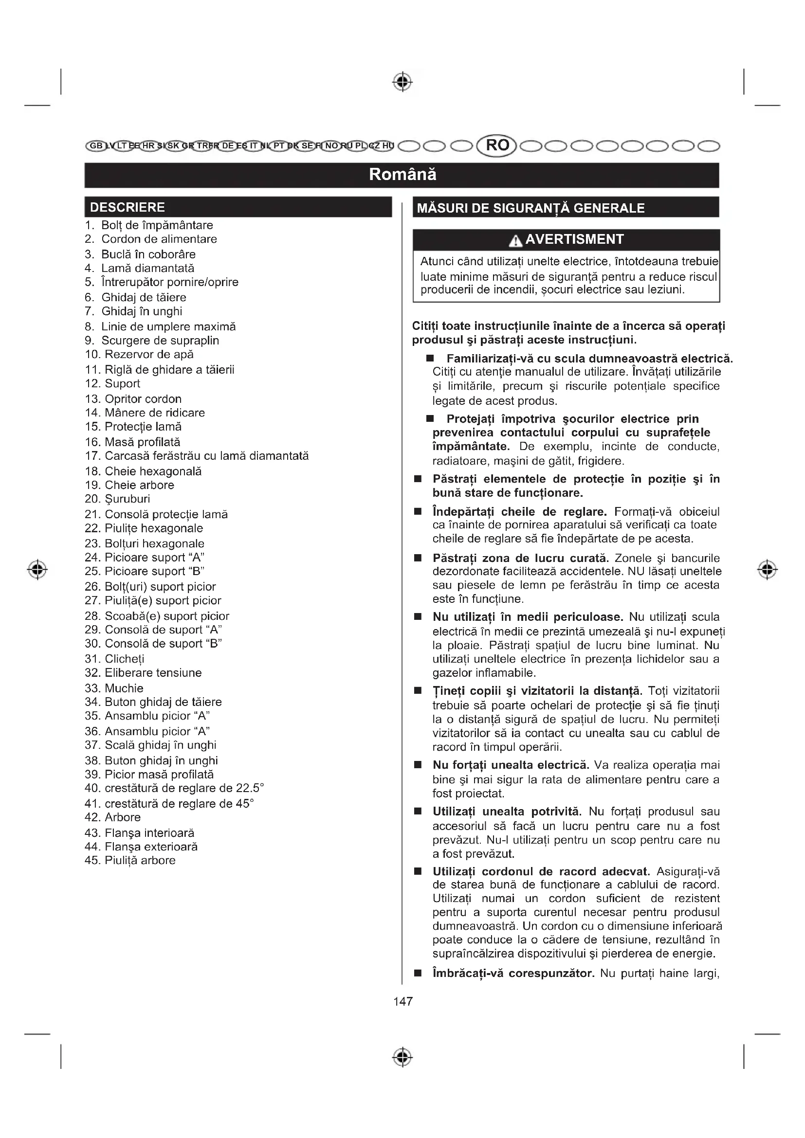 GB LV LT EE HR SI SK GR TRFR DE ES IT NL PT DK SE FI NO RU PL CZ HU mănuşi, cravate sau bijuterii. Acestea pot fi agăţate şi vă pot trage înspre părţile mobile. Mănuşile de cauciuc şi încălţămintea aderentă (cizme cu talpa din cauciuc) sunt recomandate atunci când lucraţi afară. De asemenea, în cazul în care aveţi părul lung, purtaţi o plasă de păr de protecţie, care să îl acopere. Întotdeauna purtaţi ochelari de protecţie cu apărători laterale. Ochelarii obişnuiţi dispun doar de lentile rezistente la impact; aceştia NU sunt ochelari de protecţie. Securizaţi lucrarea. Utilizaţi cleme sau o menghină pentru a ţine lucrarea, atunci când este practic.Este mai sigur decât folosirea mâinii şi lasă libere ambele mâini pentru a opera unealta. Nu vă întindeţi excesiv. În timpul operării dispozitivului, păstraţi-vă în permanenţă echilibrul şi stabilitatea. Întreţineţi unealta cu grijă. Păstraţi instrumentele ascuţite şi curate pentru o performanţă mai bună şi mai sigură. Respectaţi instrucţiunile de lubrifiere şi pentru schimbarea accesoriilor. Inspectaţi cordoanele de racord în mod periodic şi dacă sunt deteriorate, dispuneţi repararea lor de către un centru de service autorizat. Inspectaţi cordoanele de racord în mod periodic şi înlocuiţi-le dacă sunt deteriorate. Păstraţi mânerele uscate, curate şi fără uleiuri sau grăsimi. Deconectaţi uneltele. Atunci când nu se află în uz, înaintea efectuării operaţiunilor de service sau când sunt înlocuite accesorii, lame, burghie, tăietoare etc., toate uneltele trebuie deconectate. Îndepărtaţi fişa înainte de a efectua orice fel de operaţiuni de reglare, service sau întreţinere. Evitaţi pornirea accidentală a sculei. Asiguraţi-vă că comutatorul este în poziţia oprit atunci când conectaţi orice sculă. Utilizaţi accesoriile recomandate. Consultaţi manualul de utilizare pentru accesoriile recomandate. Utilizarea unor accesorii necorespunzătoare poate conduce la apariţia riscului unor răniri. Nu staţi niciodată pe unealtă. Dacă unealta de tăiere este înclinată sau dacă este atinsă accidental, ar putea interveni rănirea gravă. Verificaţi părţile deteriorate. Înainte de a continua utilizarea aparatului, un element de protecţie sau o altă componentă care este avariată trebuie să fie verificate cu atenţie pentru a determina dacă acestea vor funcţiona corespunzător şi vor îndeplini funcţiile pentru care sunt prevăzute. Verificaţi alinierea părţilor mobile, înţepenirea acestora, defectarea unor piese, montajul şi orice alte condiţii care ar putea afecta operarea aparatului. Un element de protecţie sau altă componentă care este avariată trebuie să fie reparate sau înlocuite în mod corespunzător de către un centru de reparaţii autorizat pentru a evita riscul unor răniri. Utilizaţi direcţia de alimentare corectă. Alimentaţi materialul de lucru către lamă sau tăietor numai în direcţia opusă direcţiei de rotire a lamei sau a tăietorului. Nu lăsaţi niciodată unealta să funcţioneze nesupravegheată. Opriţi alimentarea. Nu vă îndepărtaţi de unealtă decât după ce aceasta s-a oprit complet. Protejaţi-vă plămânii. Purtați o mască pentru față sau împotriva prafului dacă operația de tăiere generează praf. Protejaţi-vă auzul. Purtaţi antifoane atunci când operaţi produsul pe perioade lungi de timp. Nu forţaţi cordonul. Nu trageţi niciodată brusc de cordon pentru a-l deconecta de la priză. Ţineţi cordonul la distanţă de căldură, ulei şi muchii ascuţite. Păstraţi întotdeauna protecţia lamei în poziţie şi în bună stare de funcţionare. Ţineţi mâinile la distanţă de zona de tăiere. Ţineţi mâinile departe de lamă. Nu atingeţi lucrarea de sub, din jurul sau de deasupra lamei în timp ce aceasta se roteşte. Nu încercaţi să îndepărtaţi materialul tăiat atunci când lama este în mişcare. Lama coboară după ce este oprită. Nu utilizaţi niciodată în atmosfere ce prezintă risc de explozie. Scânteierea obişnuită a motorului ar putea aprinde vaporii. Inspectaţi periodic cordoanele uneltei. Dacă s-a avariat, dispuneţi repararea de către un tehnician de service calificat la un centru de service autorizat. Inspectaţi cordoanele de racord în mod periodic şi înlocuiţi-le dacă sunt deteriorate. Împământaţi toate uneltele. Dacă unealta este prevăzută cu o fişă cu trei ştifturi, aceasta trebuie conectată la o priză electrică cu trei găuri. Consultaţi un electrician califi cat sau personalul de service, în cazul în care instrucţiunile de împământare nu sunt complet înţelese sau dacă există nedumeriri privind împământarea adecvată a produsului. Utilizaţi doar dispozitivele electrice corecte: cabluri de racord cu 3 fire care dispun de fişe cu împământare cu 3 ştifturi şi prize de curent cu 3 poli care acceptă fişa produsului. Nu modifi caţi fi șa furnizată. În cazul în care nu se potrivește în priză, asiguraţi-vă că priza este instalată de către un electrician califi cat. Păstraţi aparatul uscat, curat şi fără urme de uleiuri şi grăsimi. Întotdeauna utilizaţi o cârpă uscată atunci când curăţaţi. Nu utilizaţi niciodată lichid de149 Română