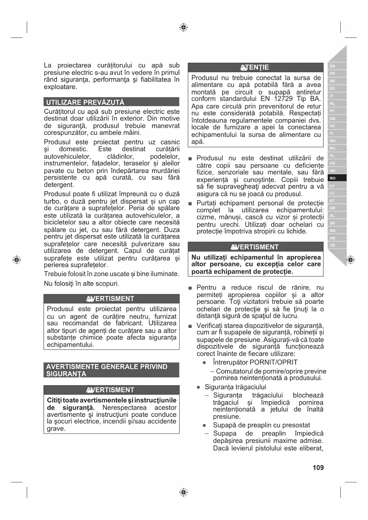 SIGURANŢA AVERTISMENT Citiţi toate avertismentele şi instrucţiunile de siguranţă. Nerespectarea acestor avertismente şi instrucţiuni poate conduce la şocuri electrice, incendii şi/sau accidente grave. ATENŢIE Produsul nu trebuie conectat la sursa de alimentare cu apă potabilă fără a avea montată pe circuit o supapă antiretur conform standardului EN 12729 Tip BA. Apa care circulă prin prevenitorul de retur nu este considerată potabilă. Respectați întotdeauna regulamentele companiei dvs. locale de furnizare a apei la conectarea echipamentului la sursa de alimentare cu apă. ■ Produsul nu este destinat utilizării de către copii sau persoane cu deficiențe fizice, senzoriale sau mentale, sau fără experiență și cunoștințe. Copiii trebuie să fie supravegheaţi adecvat pentru a vă asigura că nu se joacă cu produsul. ■ Purtați echipament personal de protecție complet la utilizarea echipamentului: cizme, mănuși, cască cu vizor și protecții pentru urechi. Utilizați doar ochelari cu protecție împotriva stropirii cu lichide. AVERTISMENT Nu utilizați echipamentul în apropierea altor persoane, cu excepția celor care poartă echipament de protecție. ■ Pentru a reduce riscul de rănire, nu permiteți apropierea copiilor și a altor persoane. Toţi vizitatorii trebuie să poarte ochelari de protecţie şi să fie ţinuţi la o distanţă sigură de spaţiul de lucru. ■ Verificați starea dispozitivelor de siguranță, cum ar fi supapele de siguranță, robineții și supapele de presiune. Asigurați-vă că toate dispozitivele de siguranță funcționează corect înainte de fiecare utilizare: ● Întrerupător PORNIT/OPRIT – Comutatorul de pornire/oprire previne pornirea neintenționată a produsului. ● Siguranța trăgaciului – Siguranța trăgaciului blochează trăgaciul și împiedică pornirea neintenționată a jetului de înaltă presiune. ● Supapă de preaplin cu presostat – Supapa de preaplin împiedică depășirea presiunii maxime admise. Dacă levierul pistolului este eliberat,110 | Română presostatul oprește pompa, iar jetul de înaltă presiune este oprit. Dacă levierul este apăsat, pompa pornește din nou. ● Dispozitiv de protecție la suprasarcină – Un senzor termic care protejează produsul împotriva suprasarcinilor. Produsul va decupla automat alimentarea atunci când se supraîncălzește. ■ Nu utilizați echipamentul dacă există componente defecte, cum ar fi dispozitivele de siguranță, furtunurile de înaltă presiune sau pistolul de stropire. ■ Acționați cu grijă trăgaciul mânerului pulverizatorului. Țineți mânerul pistolului ferm, cu ambele mâini, pentru a evita accidentarea din cauza recululului. AVERTISMENT În timpul utilizării curățitoarelor de înaltă presiune se pot forma aerosoli. Inhalarea acestora poate provoca decesul. AVERTISMENT În funcție de aplicație, se pot utiliza duze protejate pentru curățare la înaltă presiune, ceea ce va reduce emisiile de aerosoli. Cu toate acestea, nu toate aplicațiile permit utilizarea unui astfel de dispozitiv. Dacă nu se pot folosi duze protejate, este necesară purtarea unei măști de protecție de clasă FPP2 sau echivalentă, în funcție de mediul de lucru. ■ Opriți întotdeauna echipamentul dacă plecați de lângă el. ■ Jetul de înaltă presiune este periculos. Nu direcționați jetul spre persoane, echipamente electrice sau direct către echipament. ■ Pentru a evita riscul de explozie, nu pulverizați lichide inflamabile. ■ Nu îndreptați jetul spre dvs. sau spre alte persoane în scopul curățării hainelor sau încălțămintei. ■ Nu utilizați echipamentul pentru a curăța dispozitive electronice, îmbrăcăminte sau încălțăminte. ■ Pentru siguranța echipamentului este important să se utilizeze furtunuri, conectori și fitinguri de înaltă presiune. Utilizați doar furtunuri, fitinguri și conectori recomandați de producător.
