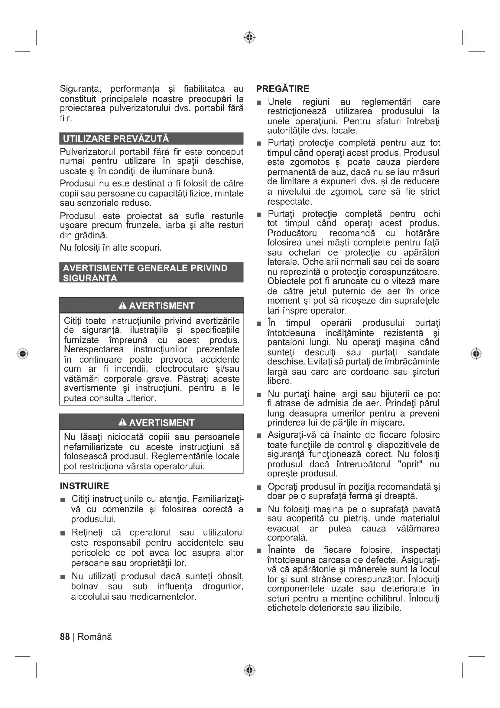 TRAVERTISMENT Dacă produsul este scăpat, suferă un impact dur sau începe să vibreze anormal, opriĠi imediat produsul úi inspectaĠi dacă este deteriorat sau identi¿ caĠi cauza vibraĠiei. Orice deteriorare trebuie reparată corespunzător sau înlocuită la un centru service autorizat. Ŷ Pentru a reduce riscul de accidentare în urma contactului cu piesele în mi܈care, opri܊i întotdeauna echipamentul atunci când nu îl utiliza܊i ܈i deconecta܊i acumulatorul. AsiguraĠi-vă că toate piesele mobile s-au oprit complet: – înainte de a lăsa produsul nesupravegheat – înainte de a verifica, curăĠa sau lucra asupra produslui – înainte de a inspecta echipamentul după ce acesta se love܈te de un corp străin – dacă produsul începe să vibreze anormal (verificaĠi imediat). AVERTISMENT Pulverizatorul dvs. portabil este furnizat cu un ham. ReglaĠi cu atenĠie hamul pentru a vă ajuta confortabil să susĠineĠi greutatea produsului. IdentificaĠi mecanismul de eliberare rapidă úi faceĠi câteva probe înainte de a folosi aparatul. Folosirea corespunzătoare poate preveni vătămarea gravă în cazul unei urgenĠe. Nu purtaĠi niciodată haine suplimentare peste centură sau în altfel să restricĠionaĠi accesul la mecanismul de eliberare rapidă. Ŷ Nu utiliza܊i niciodată pulverizatorul în apropierea focului, a căminelor cu foc deschis, în apropierea cenu܈ii fierbin܊i, a grătarelor pentru friptură, etc. Ŷ OpriĠi imediat maúina úi îndepărta܊i acumulatorul în caz de accident sau defecĠiune. Nu utilizaĠi din nou produsul înainte de a realiza o verificare completă, la un centru de service autorizat. Ŷ Produsul este furnizat cu o manetă de comandă a vitezei lângă trăgaci. Controlul vitezei reglează viteza la un nivel convenabil pentru a asigura o putere suficientă pentru a vă îndeplini sarcina. Viteza de funcĠionare joasă va ajuta la reducerea zgomotului úi avibraĠiei. Controlul vitezei reduce oboseala operatorului. Ŷ ApăsaĠi butonul turbo boost pentru a mări debitul de aer la viteză maximă. FuncĠia turbo boost prevalează asupra caracteristicii cruise control. Suflanta va reveni la viteza selectată anterior când acest buton este apăsat. AVERTISMENT Setarea controlului vitezei va opera úi bloca trăgaciul. În acest caz, trăgaciul nu se va elibera úi nu va opri suÀ anta. DezactivaĠi funcĠia de control al vitezei apăsând pârghia înainte până la capăt, pentru a opri motorul suÀ antei.