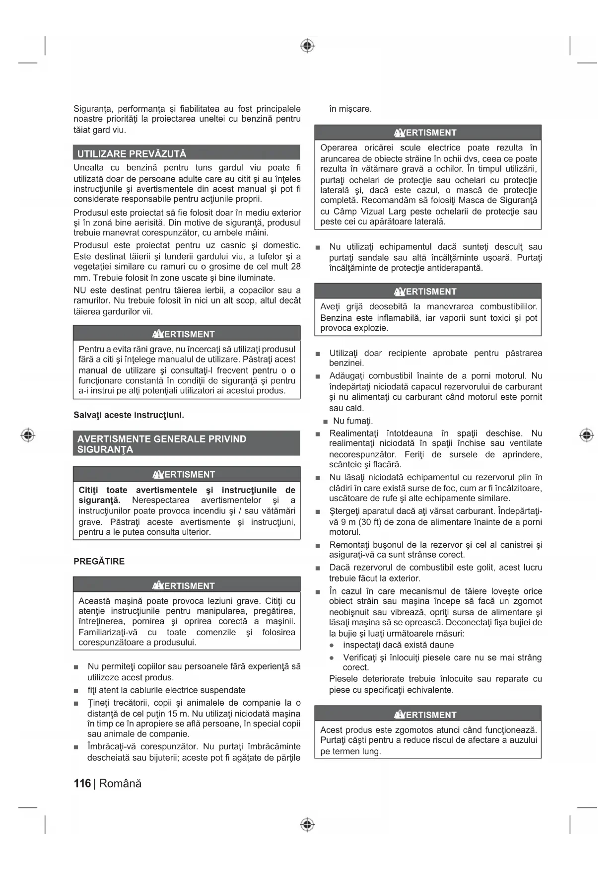 Unealta cu benzină pentru tuns gardul viu poate fi utilizată doar de persoane adulte care au citit şi au înţeles instrucţiunile şi avertismentele din acest manual şi pot fi considerate responsabile pentru acţiunile proprii. Produsul este proiectat să fi e folosit doar în mediu exterior şi în zonă bine aerisită. Din motive de siguranţă, produsul trebuie manevrat corespunzător, cu ambele mâini. Produsul este proiectat pentru uz casnic şi domestic. Este destinat tăierii şi tunderii gardului viu, a tufelor şi a vegetaţiei similare cu ramuri cu o grosime de cel mult 28 mm. Trebuie folosit în zone uscate şi bine iluminate. NU este destinat pentru tăierea ierbii, a copacilor sau a ramurilor. Nu trebuie folosit în nici un alt scop, altul decât tăierea gardurilor vii. AVERTISMENT Pentru a evita răni grave, nu încercaţi să utilizaţi produsul fără a citi şi înţelege manualul de utilizare. Păstraţi acest manual de utilizare şi consultaţi-l frecvent pentru o o funcţionare constantă în condiţii de siguranţă şi pentru a-i instrui pe alţi potenţiali utilizatori ai acestui produs. Salvaţi aceste instrucţiuni.