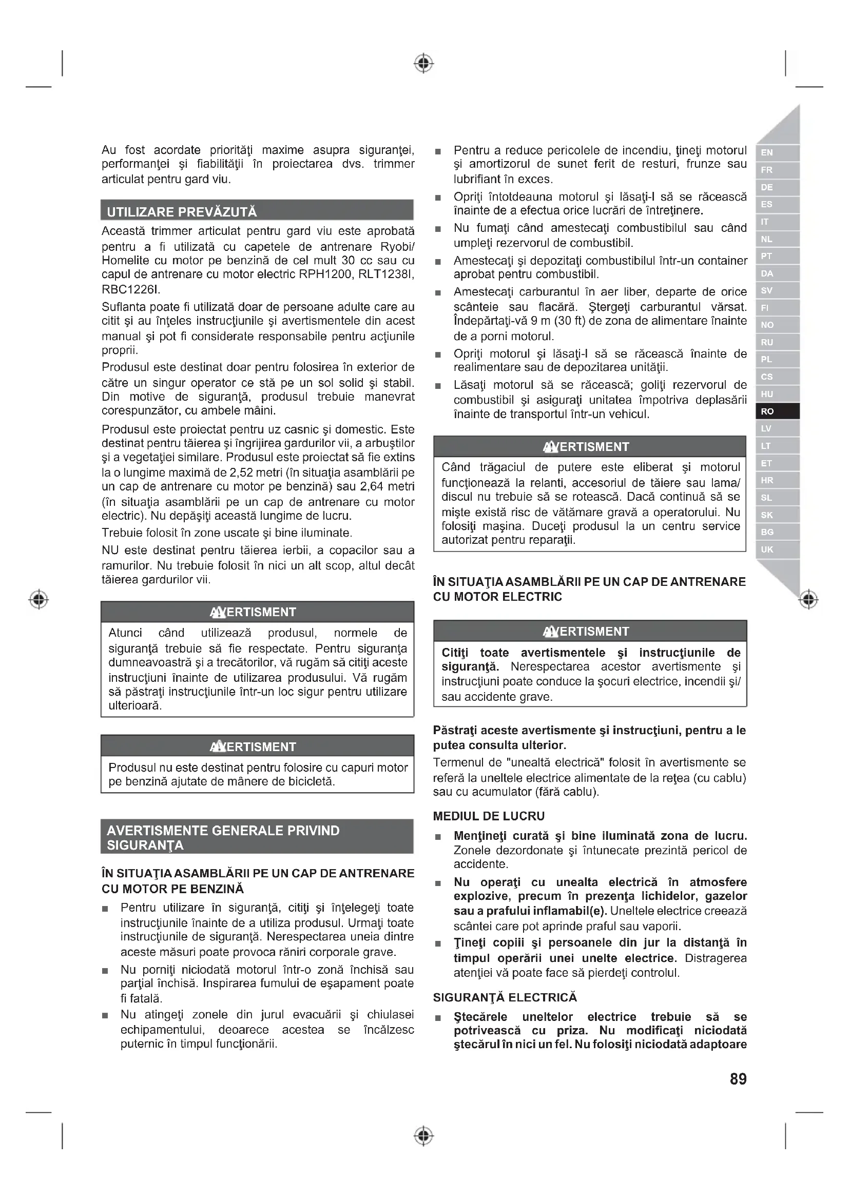 Această trimmer articulat pentru gard viu este aprobată pentru a fi utilizată cu capetele de antrenare Ryobi/ Homelite cu motor pe benzină de cel mult 30 cc sau cu capul de antrenare cu motor electric RPH1200, RLT1238I, RBC1226I. Sufl anta poate fi utilizată doar de persoane adulte care au citit şi au înţeles instrucţiunile şi avertismentele din acest manual şi pot fi considerate responsabile pentru acţiunile proprii. Produsul este destinat doar pentru folosirea în exterior de către un singur operator ce stă pe un sol solid şi stabil. Din motive de siguranţă, produsul trebuie manevrat corespunzător, cu ambele mâini. Produsul este proiectat pentru uz casnic şi domestic. Este destinat pentru tăierea şi îngrijirea gardurilor vii, a arbuştilor şi a vegetaţiei similare. Produsul este proiectat să fi e extins la o lungime maximă de 2,52 metri (în situaţia asamblării pe un cap de antrenare cu motor pe benzină) sau 2,64 metri (în situaţia asamblării pe un cap de antrenare cu motor electric). Nu depăşiţi această lungime de lucru. Trebuie folosit în zone uscate şi bine iluminate. NU este destinat pentru tăierea ierbii, a copacilor sau a ramurilor. Nu trebuie folosit în nici un alt scop, altul decât tăierea gardurilor vii. AVERTISMENT Atunci când utilizează produsul, normele de siguranţă trebuie să fie respectate. Pentru siguranţa dumneavoastră şi a trecătorilor, vă rugăm să citiţi aceste instrucţiuni înainte de utilizarea produsului. Vă rugăm să păstraţi instrucţiunile într-un loc sigur pentru utilizare ulterioară. AVERTISMENT Produsul nu este destinat pentru folosire cu capuri motor pe benzină ajutate de mânere de bicicletă.