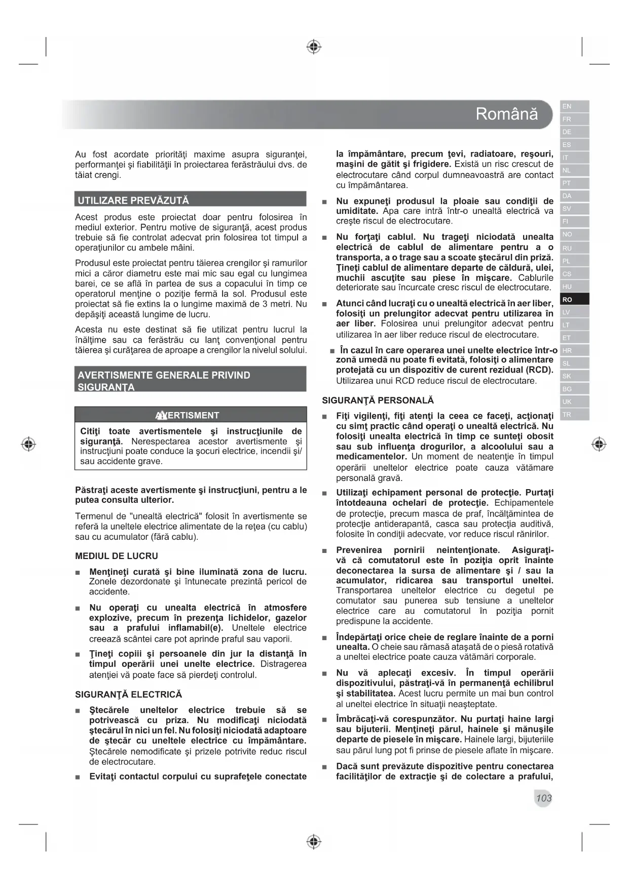 RANŢĂ. ■ Anumite regiuni au reglementări ce restricţionează folosirea produsului. Pentru sfaturi întrebaţi autorităţile dvs. locale. ■ Nu permiteţi niciodată copiilor sau persoanelor care nu sunt familiarizate cu aceste instrucţiuni să utilizeze produsul. Reglementările locale pot restricţiona vârsta operatorului. ■ Asiguraţi-vă că înainte de fiecare folosire toate funcţiile de control şi dispozitivele de siguranţă funcţionează corect. Nu folosiţi produsul dacă întrerupătorul "oprit" nu opreşte motorul. ■ Purtaţi protecţie completă pentru ochi şi pentru auz, mănuşi rezistente şi puternice precum şi protecţie a auzului atunci când operaţi produsul; folosiţi o mască de faţă dacă operaţiunea implică praf. ■ Nu purtaţi haine largi, pantaloni scurţi sau bijuterii de niciun fel. ■ Prindeţi părul lung deasupra umerilor pentru a preveni prinderea lui de părţile în mişcare. ■ Fiţi atent la obiectele aruncate, menţineţi toţi trecătorii, copiii şi animalele de companie la cel puţin 15 metri de zona de lucru. ■ Nu utilizaţi în condiţii de iluminare necorespunzătoare. Operatorul necesită o panoramă clară a zonei de lucru pentru identificarea potenţialelor pericole. ■ Utilizarea antifoanelor reduce capacitatea de auzi avertismente (alarme sau strigăte). Operatorul trebuie să fie foarte atent la ceea ce se întâmplă în zona de lucru. ■ Operarea de aparate similare în vecinătate creşte atât riscul unei deteriorări a auzului cât şi posibilitatea ca alte persoane să intre în zona dvs. de lucru. ■ Menţineţi sprijin ferm pe picioare şi echilibru. Nu vă aplecaţi excesiv. Întinderea prea lungă poate rezulta în pierderea echilibrului şi poate creşte risc de recul. ■ Ţineţi toate părţile corpului la distanţă de orice piesă în mişcare. ■ Inspectaţi aparatul înainte de fiecare folosire. Verificaţi operarea corectă a tuturor comenzilor. Verificaţi să nu existe cleme slăbite, asiguraţi-vă că toate apărătorile şi mânerele sunt corespunzător şi fix prinse. Înlocuiţi toate piesele deteriorate înainte de utilizare. ■ Nu modificaţi maşina în niciun fel sau să folosiţi părţi şi accesorii ce nu sunt recomandate de către producător. ■ Dacă sunteţi familiarizat cu acest produs, nu trebuie să deveniţi neglijent. Nu uitaţi niciodată că o secundă de neatenţie este suficientă pentru a vă răni foarte grav. ■ Ţineţi mânerele ţi suprafeţele de apucare uscate, curate, fără ulei sau grăsimi. Mânerele alunecoase şi suprafeţele neregulate nu permit o manipulare sigură şi un control al aparatului în situaţii neaşteptate. ■ Folosiţi un cablu prelungitor rezistent la intemperii. Verificaţi cablul prelungitor să nu fie deteriorat înainte de fiecare folosire. Desfăşuraţi întotdeauna cablul prelungitor în timpul folosirii întrucât cablurile nedesfăşurate se pot supraîncălzi. Cablurile prelungitoare deteriorate nu trebuie reparate, ele trebuie înlocuite cu un model echivalent.Română