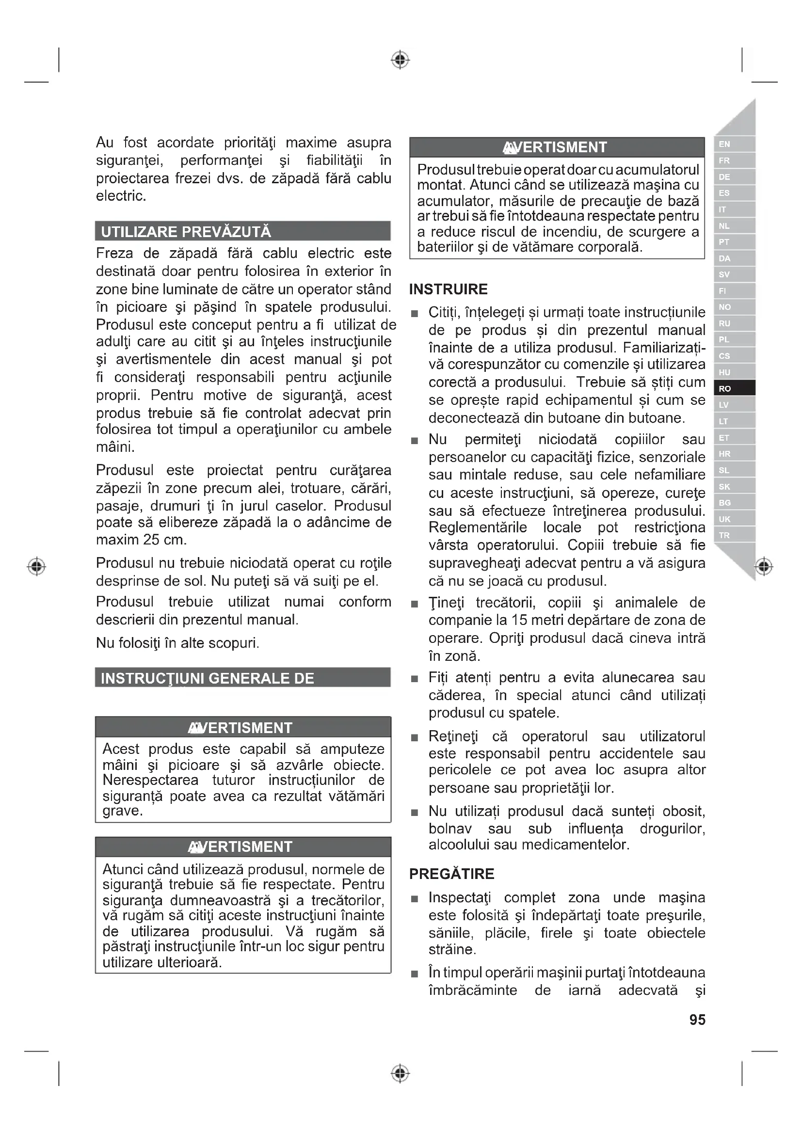 SIGURANŢĂ AVERTISMENT Acest produs este capabil să amputeze mâini şi picioare şi să azvârle obiecte. Nerespectarea tuturor instrucțiunilor de siguranță poate avea ca rezultat vătămări grave. AVERTISMENT Atunci când utilizează produsul, normele de siguranţă trebuie să fi e respectate. Pentru siguranţa dumneavoastră şi a trecătorilor, vă rugăm să citiţi aceste instrucţiuni înainte de utilizarea produsului. Vă rugăm să păstraţi instrucţiunile într-un loc sigur pentru utilizare ulterioară. AVERTISMENT Produsul trebuie operat doar cu acumulatorul montat. Atunci când se utilizează maşina cu acumulator, măsurile de precauţie de bază ar trebui să fi e întotdeauna respectate pentru a reduce riscul de incendiu, de scurgere a bateriilor şi de vătămare corporală. INSTRUIRE ■ Citiți, înțelegeți și urmați toate instrucțiunile de pe produs și din prezentul manual înainte de a utiliza produsul. Familiarizați- vă corespunzător cu comenzile și utilizarea corectă a produsului. Trebuie să știți cum se oprește rapid echipamentul și cum se deconectează din butoane din butoane. ■ Nu permiteţi niciodată copiiilor sau persoanelor cu capacităţi fizice, senzoriale sau mintale reduse, sau cele nefamiliare cu aceste instrucţiuni, să opereze, cureţe sau să efectueze întreţinerea produsului. Reglementările locale pot restricţiona vârsta operatorului. Copiii trebuie să fie supravegheaţi adecvat pentru a vă asigura că nu se joacă cu produsul. ■ Ţineţi trecătorii, copiii şi animalele de companie la 15 metri depărtare de zona de operare. Opriţi produsul dacă cineva intră în zonă. ■ Fiți atenți pentru a evita alunecarea sau căderea, în special atunci când utilizați produsul cu spatele. ■ Reţineţi că operatorul sau utilizatorul este responsabil pentru accidentele sau pericolele ce pot avea loc asupra altor persoane sau proprietăţii lor. ■ Nu utilizați produsul dacă sunteți obosit, bolnav sau sub influența drogurilor, alcoolului sau medicamentelor. PREGĂTIRE ■ Inspectaţi complet zona unde maşina este folosită şi îndepărtaţi toate preşurile, săniile, plăcile, firele şi toate obiectele străine. ■ În timpul operării maşinii purtaţi întotdeauna îmbrăcăminte de iarnă adecvată şi96 | Română încălţăminte de protecţie nealunecoasă. Evitaţi purtarea de haine largi sau care au cordoane sau şireturi etc; ele pot fi prinse în părţile în mişcare ale aparatului. ■ Purtați întotdeauna ochelari de protecție sau protecții pentru ochi în timpul operării sau în timpul efectuării reglajelor sau reparațiilor, pentru a vă proteja ochii de obiectele străine care pot fi proiectate de produs. ■ Reglați înălțimea carcasei colectorului pentru a curăța suprafețele cu pietriș sau pietre zdrobite. ■ Nu încercați niciodată să efectuați ajustări în timp ce aparatul funcţionează. ■ Prindeţi părul lung deasupra umerilor pentru a preveni prinderea lui de părţile în mişcare. ■ Asiguraţi-vă că înainte de fiecare folosire toate funcţiile de control şi dispozitivele de siguranţă funcţionează corect. Nu folosiţi produsul dacă întrerupătorul "oprit" nu opreşte produsul. ■ Înainte de fiecare folosire, inspectaţi întotdeauna vizual pentru a vedea dacă carcasa nu este deteriorată şi că apărătorile şi mânerele sunt la locul lor şi prinse corespunzător.