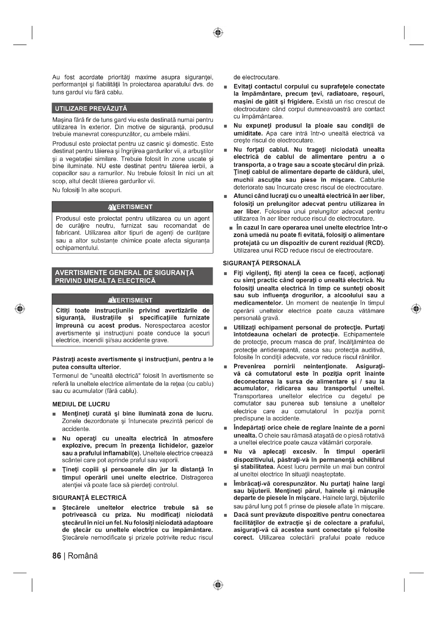 Maşina fără fi r de tuns gard viu este destinată numai pentru utilizarea în exterior. Din motive de siguranţă, produsul trebuie manevrat corespunzător, cu ambele mâini. Produsul este proiectat pentru uz casnic şi domestic. Este destinat pentru tăierea şi îngrijirea gardurilor vii, a arbuştilor şi a vegetaţiei similare. Trebuie folosit în zone uscate şi bine iluminate. NU este destinat pentru tăierea ierbii, a copacilor sau a ramurilor. Nu trebuie folosit în nici un alt scop, altul decât tăierea gardurilor vii. Nu folosiţi în alte scopuri. AVERTISMENT Produsul este proiectat pentru utilizarea cu un agent de curățire neutru, furnizat sau recomandat de fabricant. Utilizarea altor tipuri de agenți de curățare sau a altor substanțe chimice poate afecta siguranța echipamentului.