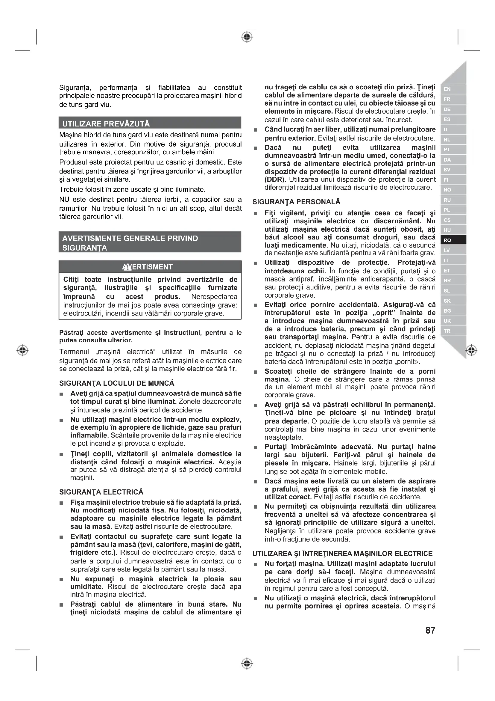 ■ Unele regiuni au reglementări care restricţionează utilizarea produsului la unele operaţiuni. Pentru sfaturi întrebaţi autorităţile dvs. locale. Citiţi toate instrucţiunile ■ Eliberaţi zona de lucru înainte de fiecare utilizare. Îndepărtaţi toate obiectele precum cabluri, becuri, fire, şnururi ce pot fi aruncate sau încurcate in mijloacele de tăiere. ■ Verificaţi gardul viu de obiecte străine precum garduri de sârmă. ■ Luaţi măsuri de precauţie suplimentare atunci când utilizaţi produsul în apropierea gardurilor, indicatoarelor, clădirilor sau a altor obiecte imobile. ■ Fiţi atent la obiectele aruncate, menţineţi toţi trecătorii, copiii şi animalele de companie la cel puţin 15 metri de zona de lucru. ■ Nu permiteţi copiilor sau persoanele fără experienţă să utilizeze acest produs. ■ Nu utilizaţi în condiţii de iluminare necorespunz ătoare. Operatorul necesită o panoramă clară a zonei de lucru pentru identificarea potenţialelor pericole. ■ Asiguraţi-vă întotdeauna că toate mânerele şi protecţiile sunt montate când utilizaţi maşina. Nu încercați niciodată să utilizați un produs incomplet sau cu modificări neautorizate. ■ Asiguraţi-vă că înainte de fiecare folosire toate funcţiile de control şi dispozitivele de siguranţă funcţionează corect. Nu folosiţi produsul dacă întrerupătorul "oprit" nu opreşte produsul. ■ Inspectaţi aparatul înainte de fiecare folosire. Verificaţi să nu fie slăbite închizătorile. Asiguraţi-vă că toate dispozitivele de protecţie şi mânerele sunt fixate corect şi strâns. Înlocuiţi toate piesele deteriorate înainte de utilizare. Verificaţi dacă există scurgeri la nivelul acumulatorului. ■ Nu modificați produsul în niciun mod. ■ Purtaţi protecţie completă a ochilor şi urechilor în timpul operării produsului. Dacă în zona de lucru există riscul căderii de obiecte, trebuie purtată protecţie a capului. ■ Purtaţi pantaloni lungi groşi, cizme şi mănuşi. Nu purtaţi haine largi, pantaloni scurţi, bijuterii de niciun fel sau să fiţi desculţ. ■ Prindeţi părul lung deasupra umerilor pentru a preveni prinderea lui de părţile în mişcare. ■ Utilizarea antifoanelor reduce capacitatea de auzi avertismente (alarme sau strigăte). Operatorul trebuie să fie foarte atent la ceea ce se întâmplă în zona de lucru. ■ Operarea de aparate similare în vecinătate creşte atât riscul unei deteriorări a auzului cât şi posibilitatea ca alte persoane să intre în zona dvs. de lucru. ■ Nu operaţi acest produs atunci când sunteţi obosit, bolnav sau sub influenţa alcoolului, drogurilor sau a medicamentelor. ■ Menţineţi sprijin ferm pe picioare şi echilibru. Nu vă aplecaţi excesiv. Întinderea excesivă poate rezulta în pierderea echilibrului şi poate rezulta în vătămare gravă. ■ Ţineţi toate părţile corpului la distanţă de orice piesă în mişcare. ■ Înainte de pornirea aparatului asiguraţi-vă ca lamele să nu vină în contact cu nimic. ■ În timpul operării aparatului de tuns gardul viu, ţineţi-l întotdeauna ferm cu ambele mâini de cele două mânere şi asiguraţi-vă că poziţia de operare este sigură şi în siguranţă. Producătorul nu recomandă folosirea treptelor sau a scărilor. Dacă este necesară o tundere la o înălţime mai mare folosiţi o unealtă prelungitoare. ■ Lamele sunt ascuţite. Atunci când manipulaţi ansamblul de lame, purtaţi mănuşi rezistente, nealunecoase. Nu puneţi degetele sau mâna între lame sau în orice poziţie unde pot fi ciupite sau tăiate. Nu atingeți discul și nu efectuați operațiuni de întreținere sau reparații ale produselor decât după ce ați scos acumulatorul sau după ce ați deconectat produsul de la orice sursă de alimentare. ■ Opriți dispozitivul și scoateți acumulatorul sau deconectați-l de la sursa de alimentare. Asiguraţi-vă că toate piesele mobile s-au oprit complet: ● înainte de a lăsa produsul nesupravegheat ● înaintea curăţării sau deblocării înfundăriii ● înainte de a ajusta poziț ia de lucru a cuțitelor ● înaintea verificării, efectuării întreţinerii sau utilizării produsului ■ Nu forţaţi motounealta pentru tuns gard viu în tufişuri dese. Acest lucru poate cauza lipirea şi încetinirea lamelor. În cazul în care lamele încetinesc, reduceţi ritmul. ■ Nu încercaţi să tăiaţi tulpini sau crengi care au o grosime mai mare de 22 mm, sau cele care sunt prea mari pentru a intra în lama de tăiere. Utilizaţi un ferăstrău manual sau un ferăstrău pentru curăţarea crengilor pentru a tăia tulpinile groase. ■ Nu utilizaţi maşina cu un dispozitiv e tăiere deteriorat sau uzat excesiv. AVERTISMENT Dacă produsul este scăpat, suferă un impact dur sau începe să vibreze anormal, opriţi imediat produsul şi inspectaţi dacă este deteriorat sau identifi caţi cauza vibraţiei. Orice deteriorare trebuie reparată corespunzător sau înlocuită la un centru service autorizat.