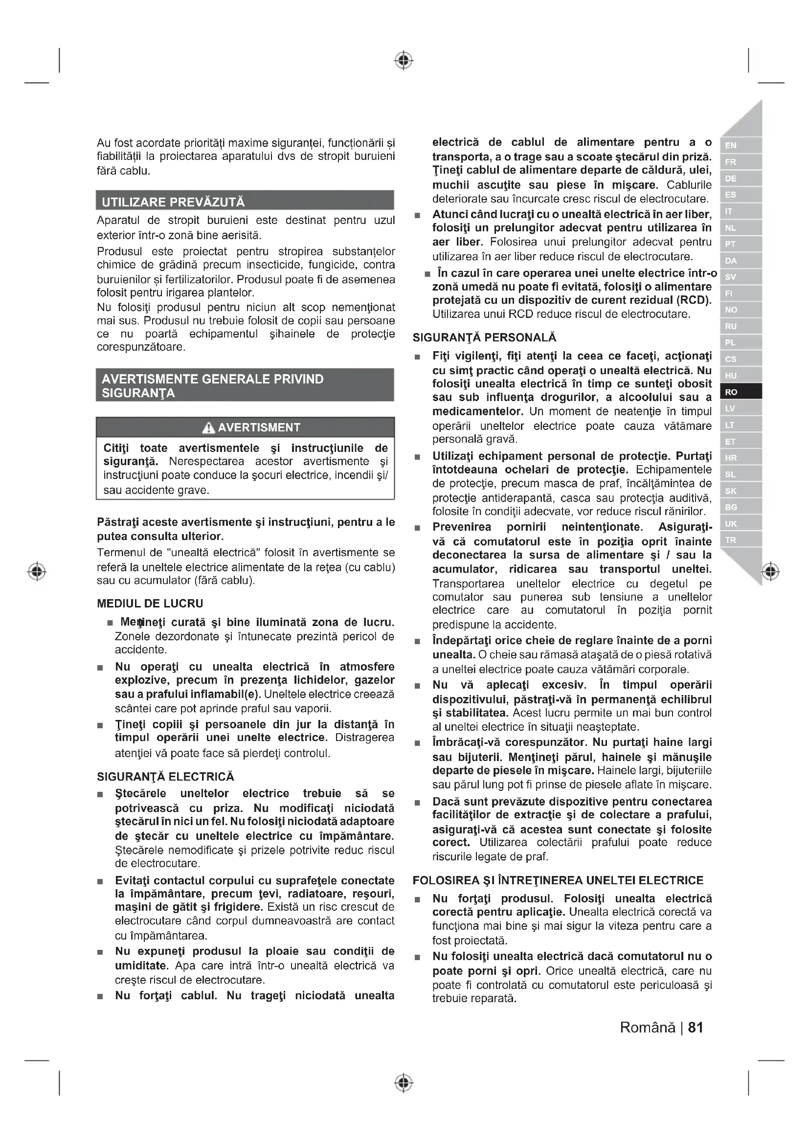 SIGURANŢA AVERTISMENT Citiţi toate avertismentele şi instrucţiunile de siguranţă. Nerespectarea acestor avertismente şi instrucţiuni poate conduce la şocuri electrice, incendii şi/ sau accidente grave. Păstraţi aceste avertismente şi instrucţiuni, pentru a le putea consulta ulterior. Termenul de "unealtă electrică" folosit în avertismente se referă la uneltele electrice alimentate de la reţea (cu cablu) sau cu acumulator (fără cablu).