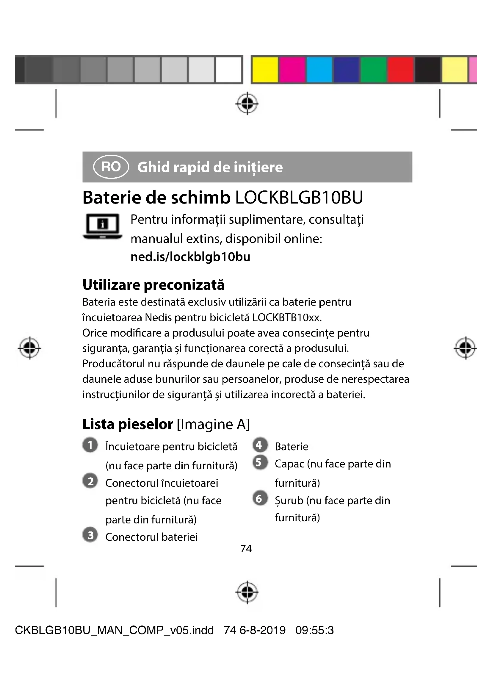 Ghid rapid de inițiere Baterie de schimb LOCKBLGB10BU Pentru informații suplimentare, consultați manualul extins, disponibil online: ned.is/lockblgb10bu Utilizare preconizată Bateria este destinată exclusiv utilizării ca baterie pentru încuietoarea Nedis pentru bicicletă LOCKBTB10xx. Orice modicare a produsului poate avea consecințe pentru siguranța, garanția și funcționarea corectă a produsului. Producătorul nu răspunde de daunele pe cale de consecință sau de daunele aduse bunurilor sau persoanelor, produse de nerespectarea instrucțiunilor de siguranță și utilizarea incorectă a bateriei. Lista pieselor [Imagine A] Baterie Capac (nu face parte din furnitură)6 Șurub (nu face parte din furnitură) Instrucțiuni de siguranță