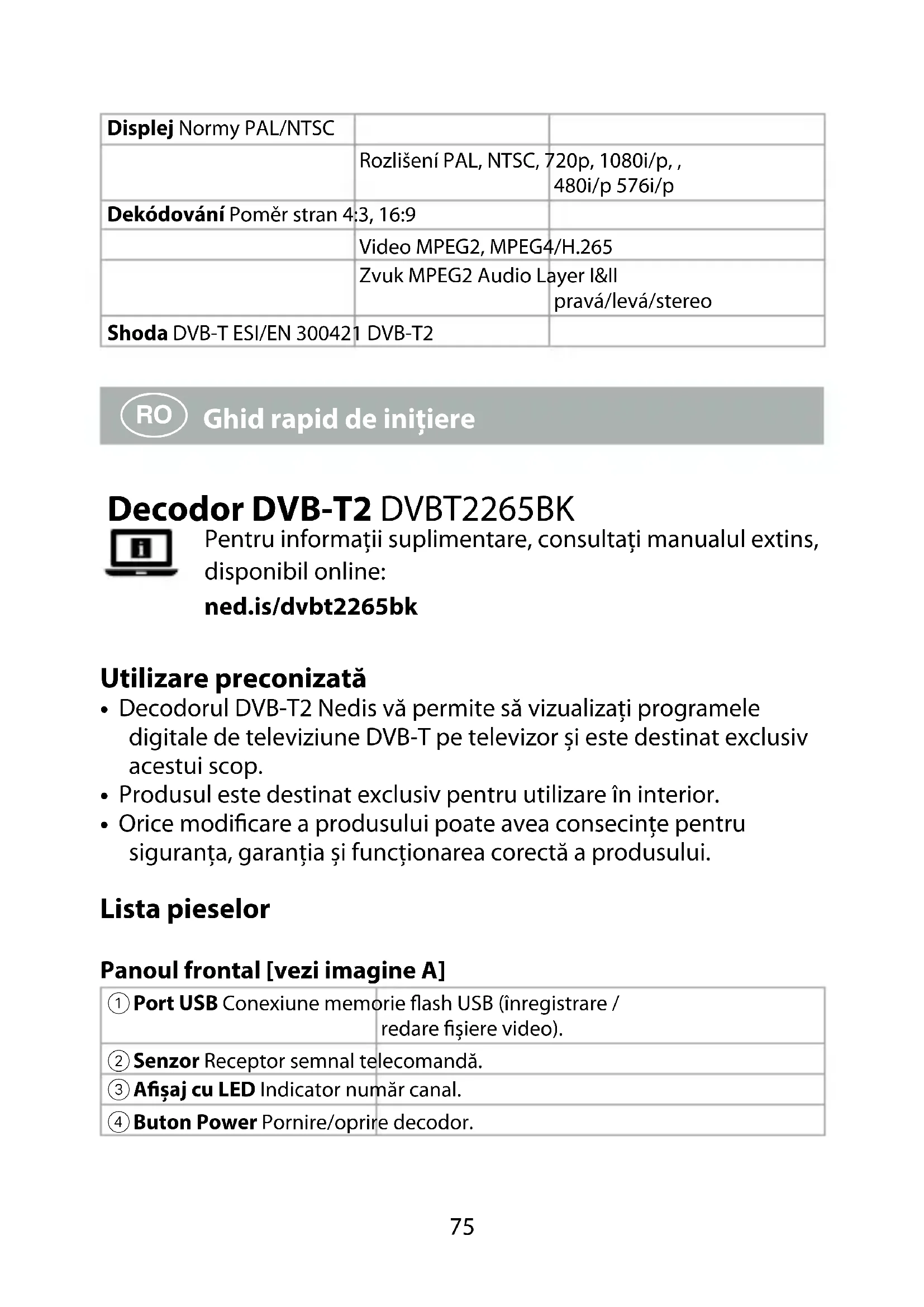 Ghid rapid de inițiere Decodor DVB-T2 DVBT2265BK Pentru informații suplimentare, consultați manualul extins, disponibil online: ned.is/dvbt2265bk Utilizare preconizată