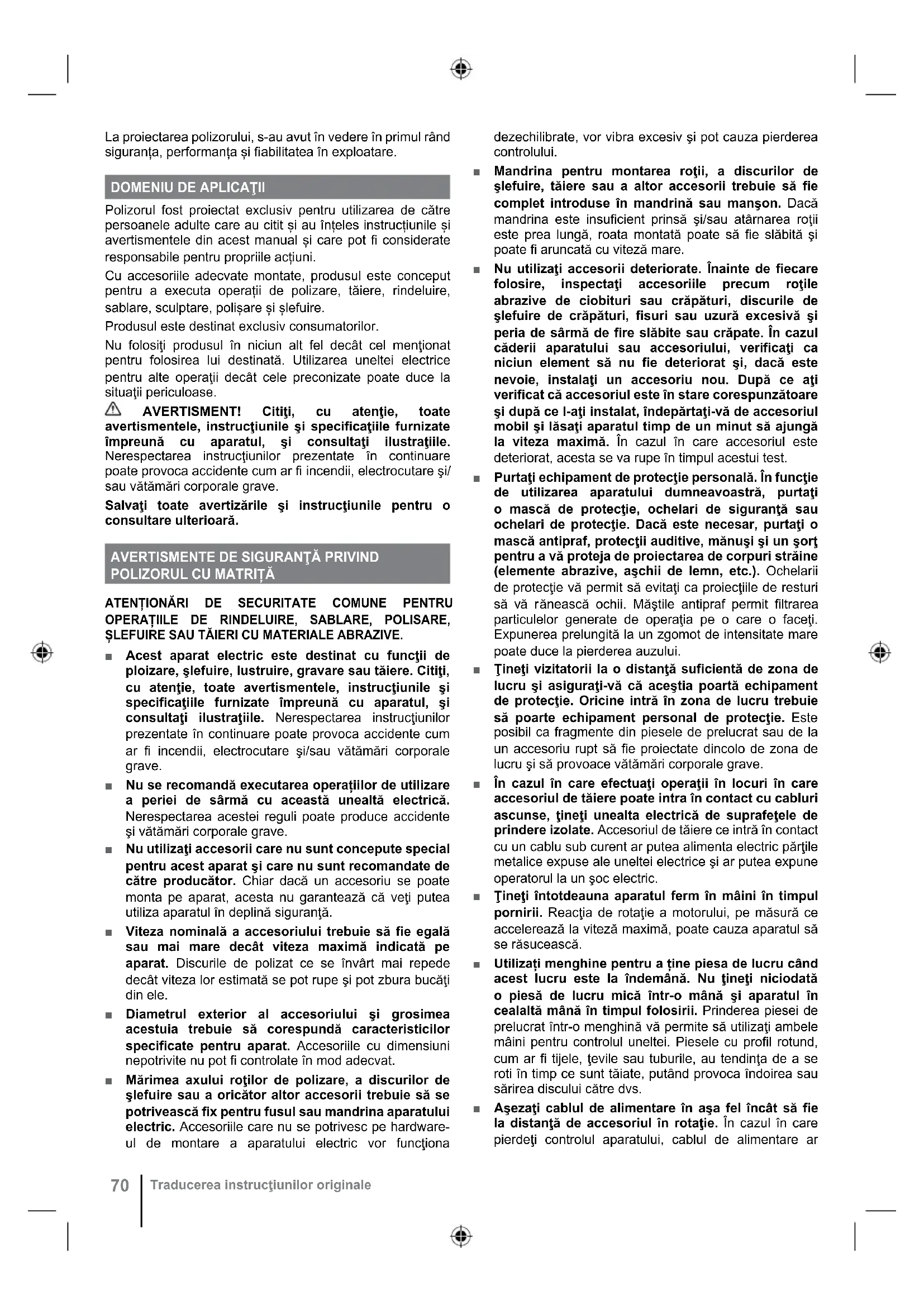 ATENȚIONĂRI DE SECURITATE COMUNE PENTRU OPERAȚIILE DE RINDELUIRE, SABLARE, POLISARE, ȘLEFUIRE SAU TĂIERI CU MATERIALE ABRAZIVE. ■ Acest aparat electric este destinat cu funcţii de ploizare, şlefuire, lustruire, gravare sau tăiere. Citiţi, cu atenţie, toate avertismentele, instrucţiunile şi specificaţiile furnizate împreună cu aparatul, şi consultaţi ilustraţiile. Nerespectarea instrucţiunilor prezentate în continuare poate provoca accidente cum ar fi incendii, electrocutare şi/sau vătămări corporale grave. ■ Nu se recomandă executarea operațiilor de utilizare a periei de sârmă cu această unealtă electrică. Nerespectarea acestei reguli poate produce accidente şi vătămări corporale grave. ■ Nu utilizaţi accesorii care nu sunt concepute special pentru acest aparat şi care nu sunt recomandate de către producător. Chiar dacă un accesoriu se poate monta pe aparat, acesta nu garantează că veţi putea utiliza aparatul în deplină siguranţă. ■ Viteza nominală a accesoriului trebuie să fie egală sau mai mare decât viteza maximă indicată pe aparat. Discurile de polizat ce se învârt mai repede decât viteza lor estimată se pot rupe şi pot zbura bucăţi din ele. ■ Diametrul exterior al accesoriului şi grosimea acestuia trebuie să corespundă caracteristicilor specificate pentru aparat. Accesoriile cu dimensiuni nepotrivite nu pot fi controlate în mod adecvat. ■ Mărimea axului roţilor de polizare, a discurilor de şlefuire sau a oricător altor accesorii trebuie să se potrivească fix pentru fusul sau mandrina aparatului electric. Accesoriile care nu se potrivesc pe hardware- ul de montare a aparatului electric vor funcţiona dezechilibrate, vor vibra excesiv şi pot cauza pierderea controlului. ■ Mandrina pentru montarea roţii, a discurilor de şlefuire, tăiere sau a altor accesorii trebuie să fie complet introduse în mandrină sau manşon. Dacă mandrina este insuficient prinsă şi/sau atârnarea roţii este prea lungă, roata montată poate să fie slăbită şi poate fi aruncată cu viteză mare. ■ Nu utilizaţi accesorii deteriorate. Înainte de fiecare folosire, inspectaţi accesoriile precum roţile abrazive de ciobituri sau crăpături, discurile de şlefuire de crăpături, fisuri sau uzură excesivă şi peria de sârmă de fire slăbite sau crăpate. În cazul căderii aparatului sau accesoriului, verificaţi ca niciun element să nu fie deteriorat şi, dacă este nevoie, instalaţi un accesoriu nou. După ce aţi verificat că accesoriul este în stare corespunzătoare şi după ce l-aţi instalat, îndepărtaţi-vă de accesoriul mobil şi lăsaţi aparatul timp de un minut să ajungă la viteza maximă. În cazul în care accesoriul este deteriorat, acesta se va rupe în timpul acestui test. ■ Purtaţi echipament de protecţie personală. În funcţie de utilizarea aparatului dumneavoastră, purtaţi o mască de protecţie, ochelari de siguranţă sau ochelari de protecţie. Dacă este necesar, purtaţi o mască antipraf, protecţii auditive, mănuşi şi un şorţ pentru a vă proteja de proiectarea de corpuri străine (elemente abrazive, aşchii de lemn, etc.). Ochelarii de protecţie vă permit să evitaţi ca proiecţiile de resturi să vă rănească ochii. Măştile antipraf permit filtrarea particulelor generate de operaţia pe o care o faceţi. Expunerea prelungită la un zgomot de intensitate mare poate duce la pierderea auzului. ■ Ţineţi vizitatorii la o distanţă suficientă de zona de lucru şi asiguraţi-vă că aceştia poartă echipament de protecţie. Oricine intră în zona de lucru trebuie să poarte echipament personal de protecţie. Este posibil ca fragmente din piesele de prelucrat sau de la un accesoriu rupt să fie proiectate dincolo de zona de lucru şi să provoace vătămări corporale grave. ■ În cazul în care efectuaţi operaţii în locuri în care accesoriul de tăiere poate intra în contact cu cabluri ascunse, ţineţi unealta electrică de suprafeţele de prindere izolate. Accesoriul de tăiere ce intră în contact cu un cablu sub curent ar putea alimenta electric părţile metalice expuse ale uneltei electrice şi ar putea expune operatorul la un şoc electric. ■ Ţineţi întotdeauna aparatul ferm în mâini în timpul pornirii. Reacţia de rotaţie a motorului, pe măsură ce accelerează la viteză maximă, poate cauza aparatul să se răsucească. ■ Utilizați menghine pentru a ține piesa de lucru când acest lucru este la îndemână. Nu ţineţi niciodată o piesă de lucru mică într-o mână şi aparatul în cealaltă mână în timpul folosirii. Prinderea piesei de prelucrat într-o menghină vă permite să utilizaţi ambele mâini pentru controlul uneltei. Piesele cu profil rotund, cum ar fi tijele, ţevile sau tuburile, au tendinţa de a se roti în timp ce sunt tăiate, putând provoca îndoirea sau sărirea discului către dvs. ■ Aşezaţi cablul de alimentare în aşa fel încât să fie la distanţă de accesoriul în rotaţie. În cazul în care pierdeţi controlul aparatului, cablul de alimentare ar