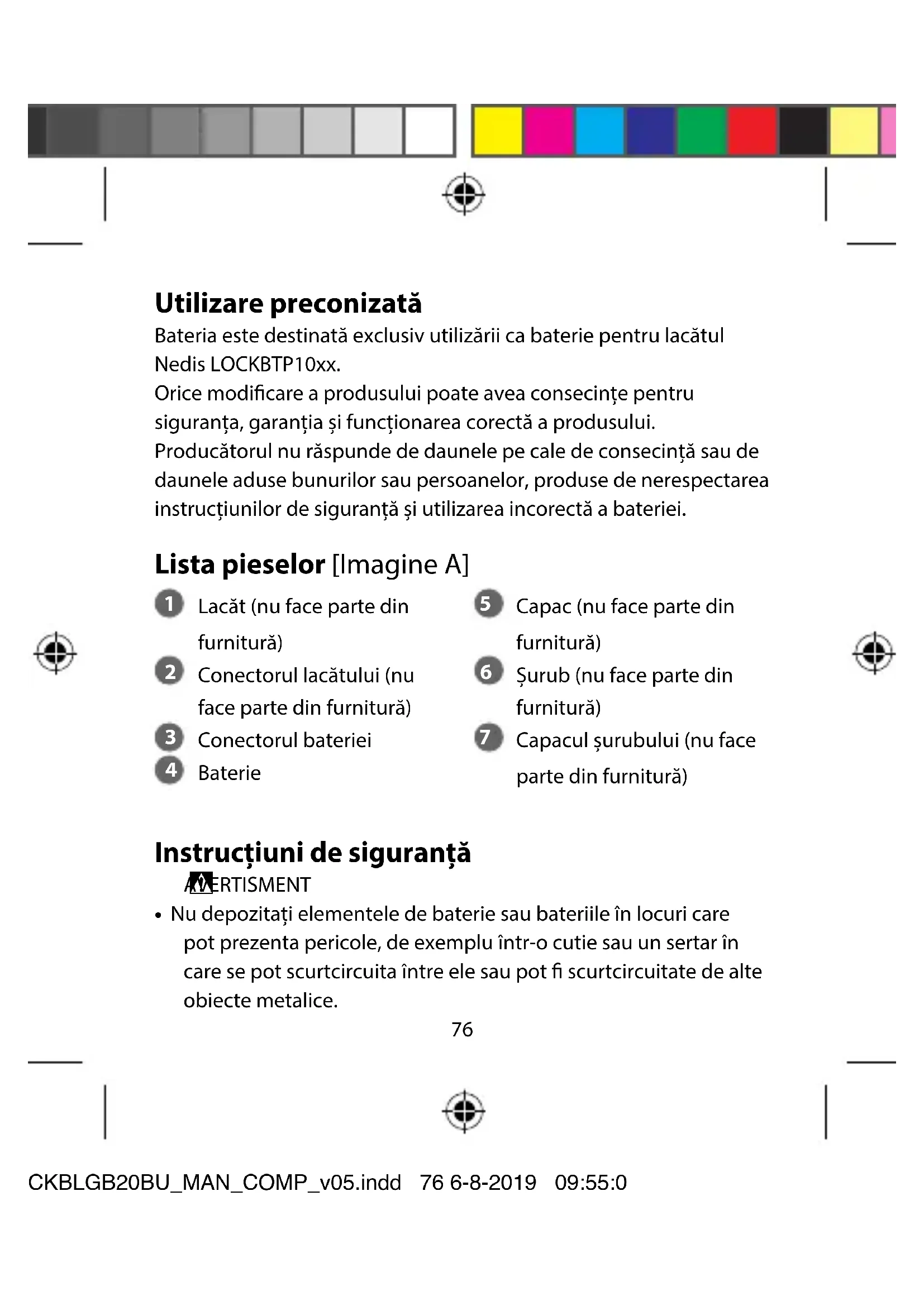 - Nu depozitați elementele de baterie sau bateriile în locuri care pot prezenta pericole, de exemplu într-o cutie sau un sertar în care se pot scurtcircuita între ele sau pot scurtcircuitate de alte obiecte metalice. LOCKBLGB20BU_MAN_COMP_v05.indd 76 6-8-2019 09:55:0877 Utilizare preconizată Bateria este destinată exclusiv utilizării ca baterie pentru lacătul Nedis LOCKBTP10xx. Orice modicare a produsului poate avea consecințe pentru siguranța, garanția și funcționarea corectă a produsului. Producătorul nu răspunde de daunele pe cale de consecință sau de daunele aduse bunurilor sau persoanelor, produse de nerespectarea instrucțiunilor de siguranță și utilizarea incorectă a bateriei. Lista pieselor [Imagine A]
