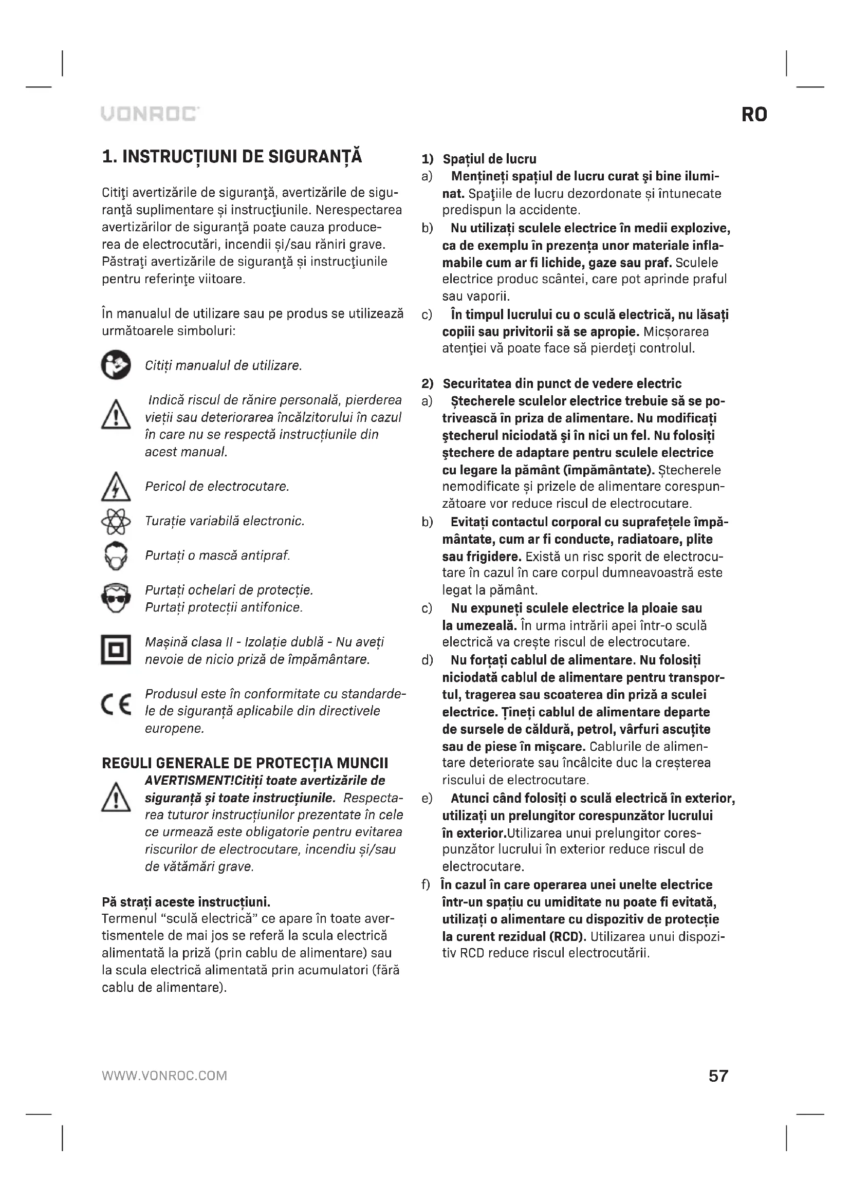 Citiţi avertizările de siguranţă, avertizările de sigu- ranţă suplimentare şi instrucţiunile. Nerespectarea avertizărilor de siguranţă poate cauza produce- rea de electrocutări, incendii şi/sau răniri grave. Păstraţi avertizările de siguranţă şi instrucţiunile pentru referinţe viitoare. În manualul de utilizare sau pe produs se utilizează următoarele simboluri: Citiţi manualul de utilizare. Indică riscul de rănire personală, pierderea vieţii sau deteriorarea încălzitorului în cazul în care nu se respectă instrucţiunile din acest manual. Pericol de electrocutare. Turaţie variabilă electronic. Purtaţi o mască antipraf. Purtaţi ochelari de protecţie. Purtaţi protecţii antifonice. Maşină clasa II - Izolaţie dublă - Nu aveţi nevoie de nicio priză de împământare. Produsul este în conformitate cu standarde- le de siguranţă aplicabile din directivele europene.