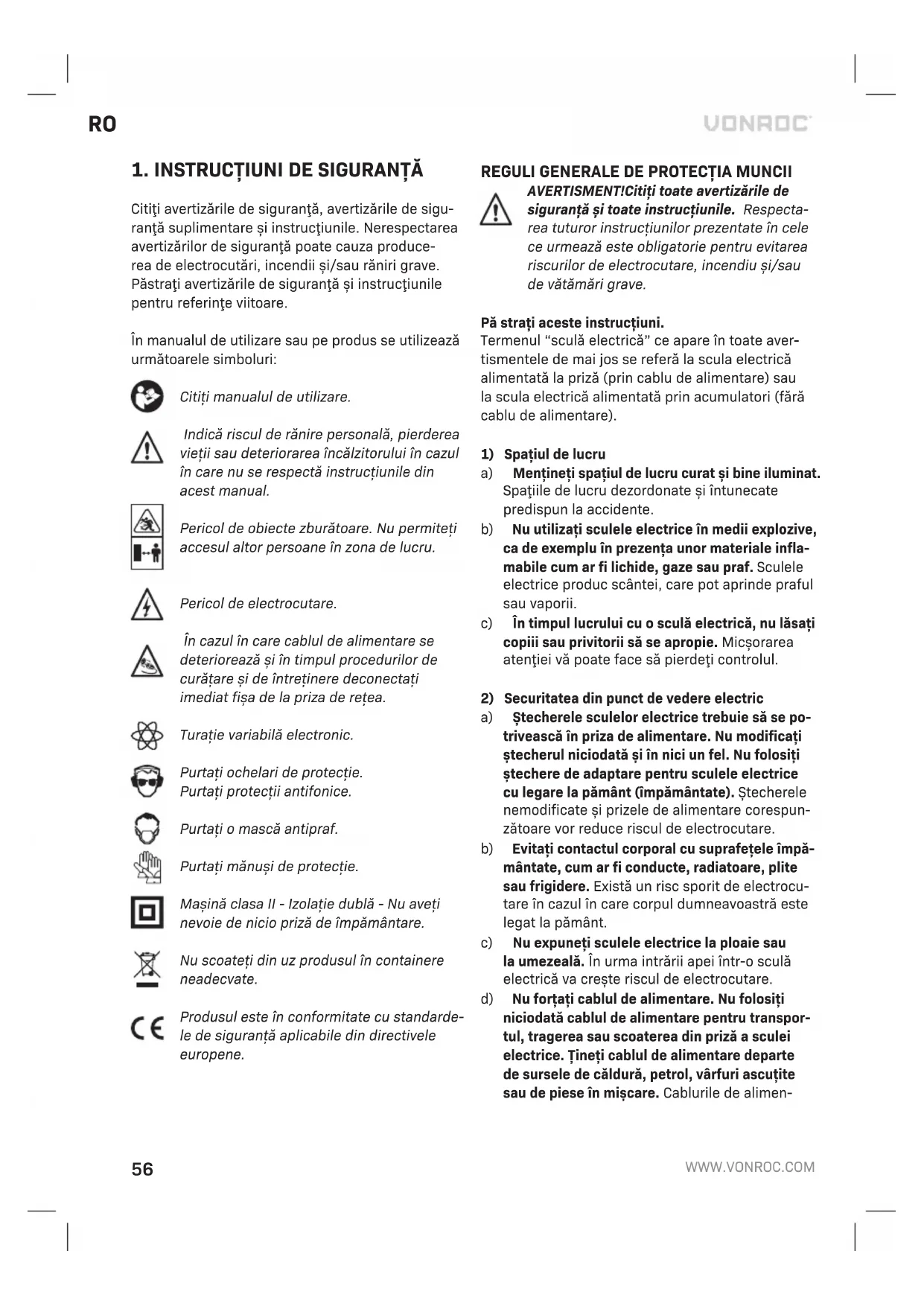 Aparatele electrice sau electronice deteriorate si/sau defecte trebuie colectate în locurile de reciclare corespunzatoare. Numai pentru tarile din CE Nu aruncati echipamentele actionate electric împreuna cu gunoiul menajer. Conform Indicatiei europene 2012/19/EU pentru echipamente electrice si electronice uzate si a implementarii sale la nivel national, echipamentele actionate electric scoase din uz trebuie colectate separat si evacuate într-o maniera ecologica. GARANŢIE Produsele VONROC sunt realizate la cele mai inalte standarde de calitate şi sunt garantate in privinţa materialelor şi a manoperei pentru intreaga perioadă de utilizare in garanţie, incepand cu data achiziţiei. In cazul in care produsul se defectează in timpul perioadei de utilizare, contactaţi direct VONROC. Următoarele circumstanţe sunt excluse de la această garanţie: