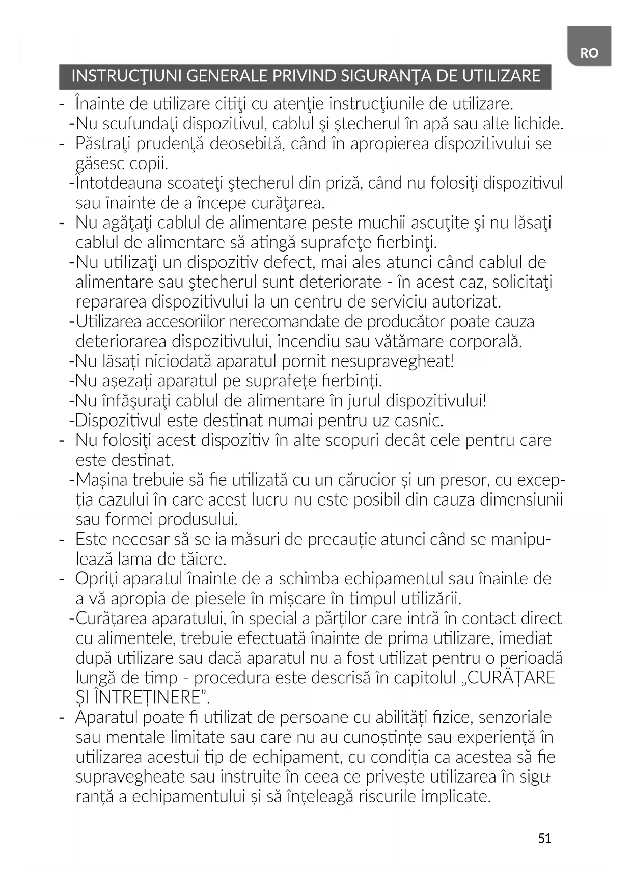 Curățarea aparatului, în special a părților care intră în contact direct cu alimentele, trebuie efectuată înainte de prima ulizare, imediat după ulizare sau dacă aparatul nu a fost ulizat pentru o perioadă lungă de mp - procedura este descrisă în capitolul „CURĂȚARE ȘI ÎNTREȚINERE”. - Aparatul poate ulizat de persoane cu abilități zice, senzoriale sau mentale limitate sau care nu au cunoșnțe sau experiență în ulizarea acestui p de echipament, cu condiția ca acestea să e supravegheate sau instruite în ceea ce privește ulizarea în sigu