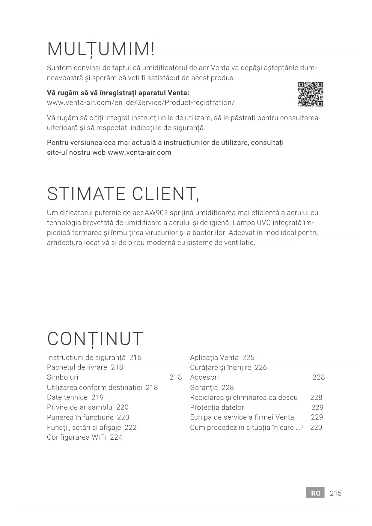 Adott esetben frissítse okostelefonja, illetve táblagépe operációs rendszerét.215DE 215RO Instrucțiuni de siguranță 216 Pachetul de livrare 218 Simboluri 218 Utilizarea conform destinației 218 Date tehnice 219 Privire de ansamblu 220 Punerea în funcțiune 220 Funcții, setări și afișaje 222 Configurarea WiFi 224 Aplicația Venta 225 Curățare și îngrijire 226 Accesorii 228 Garanția 228 Reciclarea și eliminarea ca deșeu 228 Protecția datelor 229 Echipa de service a firmei Venta 229 Cum procedez în situația în care …? 229 MULȚUMIM! Suntem convinși de faptul că umidificatorul de aer Venta va depăși așteptările dum- neavoastră și sperăm că veți fi satisfăcut de acest produs. Vă rugăm să vă înregistrați aparatul Venta: www.venta-air.com/en_de/Service/Product-registration/ Vă rugăm să citiți integral instrucțiunile de utilizare, să le păstrați pentru consultarea ulterioară și să respectați indicațiile de siguranță. Pentru versiunea cea mai actuală a instrucțiunilor de utilizare, consultați site-ul nostru web www.venta-air.com STIMATE CLIENT, Umidificatorul puternic de aer AW902 sprijină umidificarea mai eficientă a aerului cu tehnologia brevetată de umidificare a aerului și de igienă. Lampa UVC integrată îm- piedică formarea și înmulțirea virusurilor și a bacteriilor. Adecvat în mod ideal pentru arhitectura locativă și de birou modernă cu sisteme de ventilație.