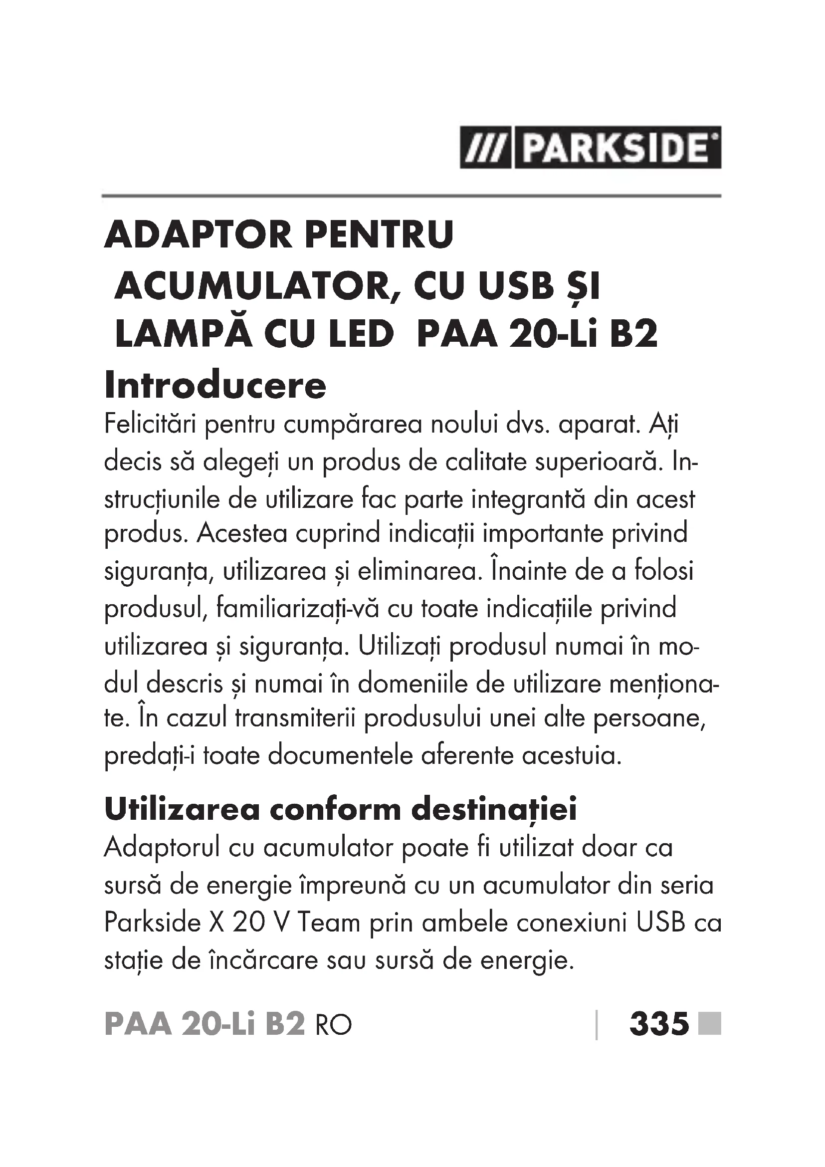 LAMPĂ CU LED PAA 20-Li B2 Introducere Felicitări pentru cumpărarea noului dvs. aparat. Aţi decis să alegeţi un produs de calitate superioară. In- strucţiunile de utilizare fac parte integrantă din acest produs. Acestea cuprind indicaţii importante privind siguranţa, utilizarea și eliminarea. Înainte de a folosi produsul, familiarizaţi-vă cu toate indicaţiile privind utilizarea și siguranţa. Utilizaţi produsul numai în mo- dul descris și numai în domeniile de utilizare menţiona- te. În cazul transmiterii produsului unei alte persoane, predaţi-i toate documentele aferente acestuia. Utilizarea conform destinaţiei Adaptorul cu acumulator poate fi utilizat doar ca sursă de energie împreună cu un acumulator din seria Parkside X 20 V Team prin ambele conexiuni USB ca staţie de încărcare sau sursă de energie.PAA 20-Li B2■ 336