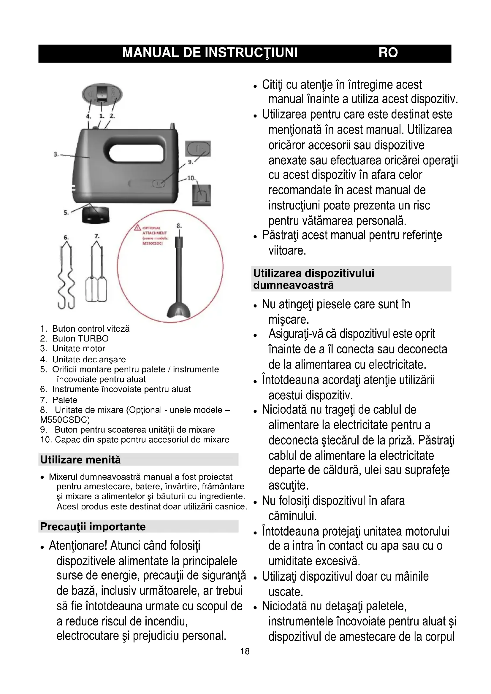- Mixerul dumneavoastră manual a fost proiectat pentru amestecare, batere, învârtire, frământare şi mixare a alimentelor şi băuturii cu ingrediente. Acest produs este destinat doar utilizării casnice. Precauţii importante