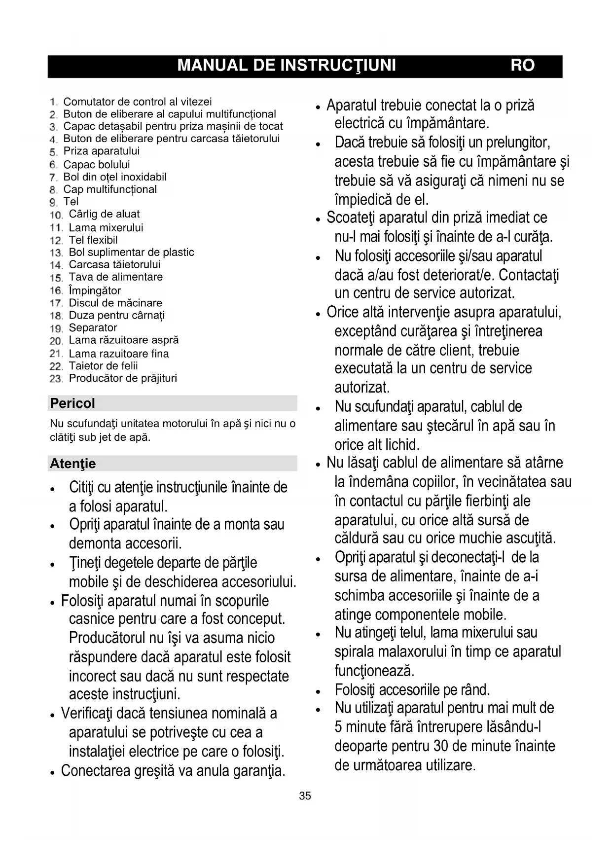 Comutator de control al vitezei Buton de eliberare al capului multifuncțional Capac detașabil pentru priza mașinii de tocat Buton de eliberare pentru carcasa tăietorului Priza aparatului Capac bolului Bol din oțel inoxidabil Cap multifuncțional Tel Cârlig de aluat Lama mixerului Tel flexibil Bol suplimentar de plastic Carcasa tăietorului Tava de alimentare Împingător Discul de măcinare Duza pentru cârnați Separator Lama răzuitoare aspră Lama razuitoare fina Taietor de felii Producător de prăjituri Pericol Nu scufundaţi unitatea motorului în apă şi nici nu o clătiţi sub jet de apă. Atenţie