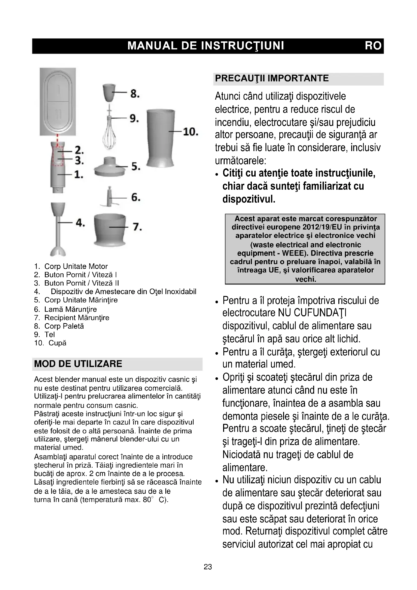 Acest blender manual este un dispozitiv casnic şi nu este destinat pentru utilizarea comercială. Utilizaţi-l pentru prelucrarea alimentelor în cantităţi normale pentru consum casnic. Păstraţi aceste instrucţiuni într-un loc sigur şi oferiţi-le mai departe în cazul în care dispozitivul este folosit de o altă persoană. Înainte de prima utilizare, ştergeţi mânerul blender-ului cu un material umed. Asamblaţi aparatul corect înainte de a introduce ştecherul în priză. Tăiaţi ingredientele mari în bucăţi de aprox. 2 cm înainte de a le procesa. Lăsaţi ingredientele fierbinţi să se răcească înainte de a le tăia, de a le amesteca sau de a le turna în cană (temperatură max. 80°C).
