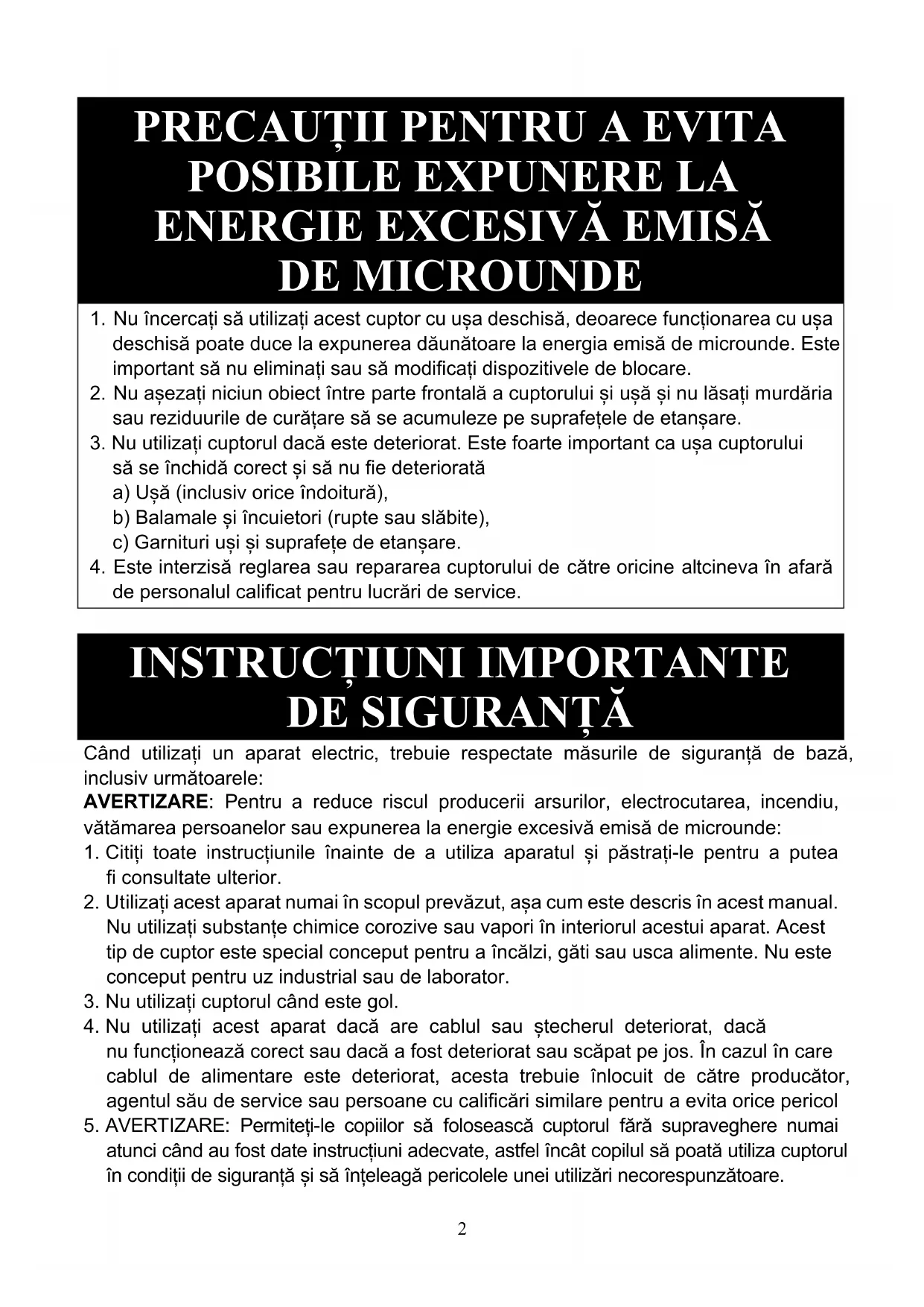 DE SIGURANȚĂ Când utilizați un aparat electric, trebuie respectate măsurile de siguranță de bază, inclusiv următoarele: AVERTIZARE: Pentru a reduce riscul producerii arsurilor, electrocutarea, incendiu, vătămarea persoanelor sau expunerea la energie excesivă emisă de microunde: