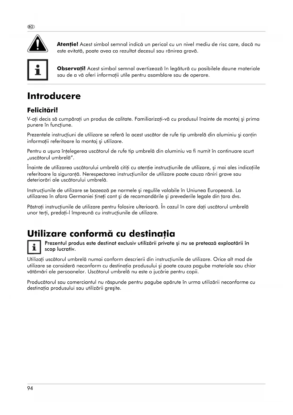 Atenție! Acest simbol semnal indică un pericol cu un nivel mediu de risc care, dacă nu este evitată, poate avea ca rezultat decesul sau rănirea gravă. Observați! Acest simbol semnal avertizează în legătură cu posibilele daune materiale sau de a vă oferi informaii utile pentru asamblare sau de operare. Introducere Felicitări! V-ai decis să cumpărai un produs de calitate. Familiarizai-vă cu produsul înainte de montaj şi prima punere în funciune. Prezentele instruciuni de utilizare se referă la acest uscător de rufe tip umbrelă din aluminiu şi conin informaii referitoare la montaj şi utilizare. Pentru a uşura înelegerea uscătorul de rufe tip umbrelă din aluminiu va fi numit în continuare scurt „uscătorul umbrelă”. Înainte de utilizarea uscătorului umbrelă citii cu atenie instruciunile de utilizare, şi mai ales indicaiile referitoare la sigurană. Nerespectarea instruciunilor de utilizare poate cauza răniri grave sau deteriorări ale uscătorului umbrelă. Instruciunile de utilizare se bazează pe normele şi regulile valabile în Uniunea Europeană. La utilizarea în afara Germaniei inei cont şi de recomandările şi prevederile legale din ara dvs. Păstrai instruciunile de utilizare pentru folosire ulterioară. În cazul în care dai uscătorul umbrelă unor teri, predai-l împreună cu instruciunile de utilizare. Utilizare conformă cu destinaţia