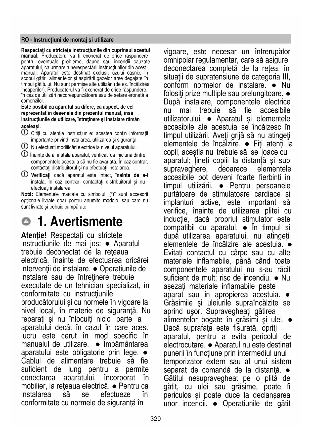 Atenție! Respectați cu strictețe instrucțiunile de mai jos: ● Aparatul trebuie deconectat de la reţeaua electrică, înainte de efectuarea oricărei intervenţii de instalare. ● Operațiunile de instalare sau de întreţinere trebuie executate de un tehnician specializat, în conformitate cu instrucţiunile producătorului şi cu normele în vigoare la nivel local, în materie de siguranţă. Nu reparaţi şi nu înlocuiţi nicio parte a aparatului decât în cazul în care acest lucru este cerut în mod specific în manualul de utilizare. ● Împământarea aparatului este obligatorie prin lege. ● Cablul de alimentare trebuie să fie suficient de lung pentru a permite conectarea aparatului, încorporat în mobilier, la reţeaua electrică. ● Pentru ca instalarea să se efectueze în conformitate cu normele de siguranță în vigoare, este necesar un întrerupător omnipolar regulamentar, care să asigure deconectarea completă de la rețea, în situații de supratensiune de categoria III, conform normelor de instalare. ● Nu folosiţi prize multiple sau prelungitoare. ● După instalare, componentele electrice nu mai trebuie să fie accesibile utilizatorului. ● Aparatul și elementele accesibile ale acestuia se încălzesc în timpul utilizării. Aveţi grijă să nu atingeţi elementele de încălzire. ● Fiți atenți la copii, aceștia nu trebuie să se joace cu aparatul; țineți copiii la distanță şi sub supraveghere, deoarece elementele accesibile pot deveni foarte fierbinți in timpul utilizării. ● Pentru persoanele purtătoare de stimulatoare cardiace și implanturi active, este important să verifice, înainte de utilizarea plitei cu inducție, dacă propriul stimulator este compatibil cu aparatul. ● În timpul și după utilizarea aparatului, nu atingeți elementele de încălzire ale acestuia. ● Evitați contactul cu cârpe sau cu alte materiale inflamabile, până când toate componentele aparatului nu s-au răcit suficient de mult; risc de incendiu. ● Nu așezați materiale inflamabile peste aparat sau în apropierea acestuia. ● Grăsimile şi uleiurile supraîncălzite se aprind uşor. Supravegheați gătirea alimentelor bogate în grăsimi şi ulei. ● Dacă suprafaţa este fisurată, opriţi aparatul, pentru a evita pericolul de electrocutare. ● Aparatul nu este destinat punerii în funcțiune prin intermediul unui temporizator extern sau al unui sistem separat de comandă de la distanţă. ● Gătitul nesupravegheat pe o plită de gătit, cu ulei sau grăsime, poate fi periculos şi poate duce la declanșarea unor incendii. ● Operațiunile de gătit330 trebuie să fie supravegheate. Un proces de gătire de scurtă durată trebuie supravegheat în permanență. ● Nu încercați NICIODATĂ să stingeți flăcările cu apă. Dimpotrivă, opriţi aparatul şi înăbușiți flăcările, folosind de exemplu un capac sau o pătură ignifugă. Pericol de incendiu: nu aşezaţi obiecte pe suprafeţele de gătit. ● Nu utilizați aparate de curăţare cu aburi; risc de electrocutare. ● Nu aşezaţi obiecte metalice, cum ar fi cuțite, furculițe, linguri și capace pe suprafaţa plitei de gătit, deoarece se pot supraîncălzi. ● Înainte de a conecta aparatul la reţeaua electrică: verificaţi plăcuţa cu date tehnice (aplicată în partea inferioară a aparatului) pentru a vă asigura că tensiunea şi puterea corespund celor ale rețelei, iar priza este potrivită. În caz de neclarități, adresați-vă unui electrician calificat. Important: ● După utilizare, închideți plita de gătit de la dispozitivul său de comandă şi nu vă bazaţi pe detectorul de vase de gătit. ● Evitaţi scurgerile de lichide și prin urmare, pentru a fierbe sau pentru a încălzi lichide, reduceţi alimentarea cu căldură. ● Nu lăsați elementele de încălzire pornite, cu oale şi tigăi goale sau fără recipiente pe acestea. ● După ce ați terminat de gătit, închideți respectiva zonă de gătit. ● Pentru a găti, nu folosiți niciodată coli de aluminiu și nu așezați niciodată direct pe plită produse ambalate în aluminiu. Aluminiul se poate topi și poate avaria iremediabil aparatul dumneavoastră. ● Nu încălziți niciodată o conservă sau un borcan din aluminiu ce conține alimente, fără să-l fi deschis mai întâi: ar putea exploda! Acest avertisment se aplică tuturor celorlalte tipuri de plite de gătit. ● Utilizarea unei puteri ridicate cum este funcţia Booster nu este adecvată pentru încălzirea unor anumite lichide cum ar fi, de exemplu, uleiul pentru prăjit. Căldura excesivă poate fi periculoasă. În astfel de situații, se recomandă utilizarea unei puteri mai scăzute. ● Recipientele trebuie așezate direct pe plita de gătit şi trebuie centrate. Sub nicio formă nu introduceţi alte obiecte între vasul de gătit şi plita de gătit. ● În cazul unor temperaturi ridicate, aparatul va reduce automat nivelul de putere aferent zonelor de gătit. ● Înaintea oricărei operațiuni de curățare sau de întreținere, decuplați aparatul de la rețeaua electrică, scoțându-l din priză sau decuplând întrerupătorul general de curent din locuință. ● Pentru toate operațiunile de instalare și întreținere, echipați-vă cu mănuși de protecție. ● Aparatul poate fi utilizat de copii cu vârsta mai mare de 8 ani şi de persoane cu capacităţi fizice, senzoriale sau mentale reduse, sau lipsite de experienţa sau cunoştinţele necesare, numai sub supraveghere sau numai după ce acestea au fost instruite cu privire la utilizarea în siguranţă a aparatului şi după ce au luat la cunoştinţă pericolele pe care le implică utilizarea acestuia. ● Copiii trebuie supravegheați, pentru a vă asigura că nu se joacă cu aparatul. ● Operaţiunile de curăţare şi întreţinere nu trebuie efectuate de copii nesupravegheaţi. ● Încăperea trebuie să fie suficient de bine ventilată,